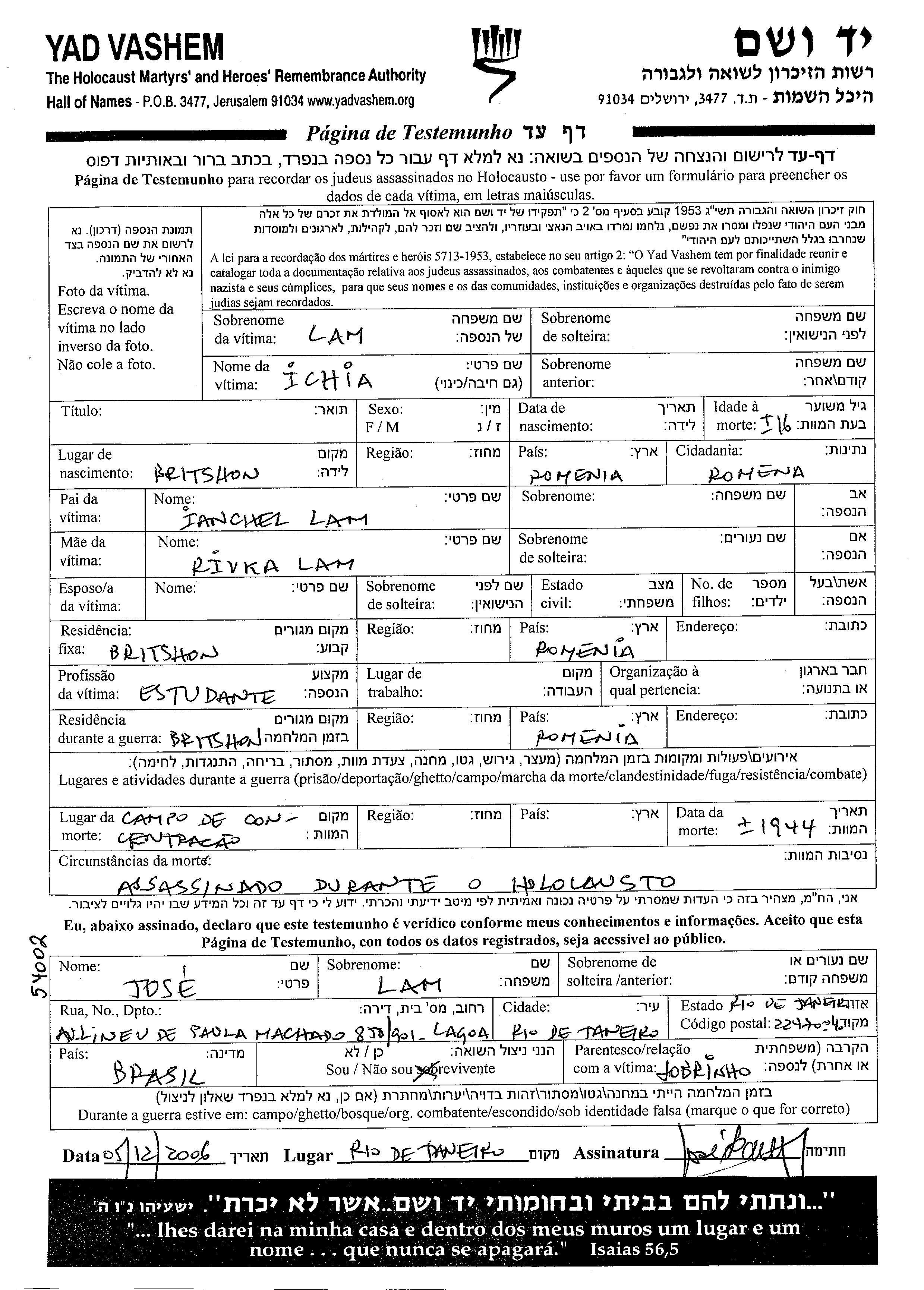 Ichia Lam wurde in Bricena, Rumänien geboren. Er war der Sohn von Janchel und Rivka. Er war Student und Jugendliche/-r. Vor dem Zweiten Weltkrieg lebte er in Bricena, Rumänien. Während des Krieges war er in Bricena, Rumänien.