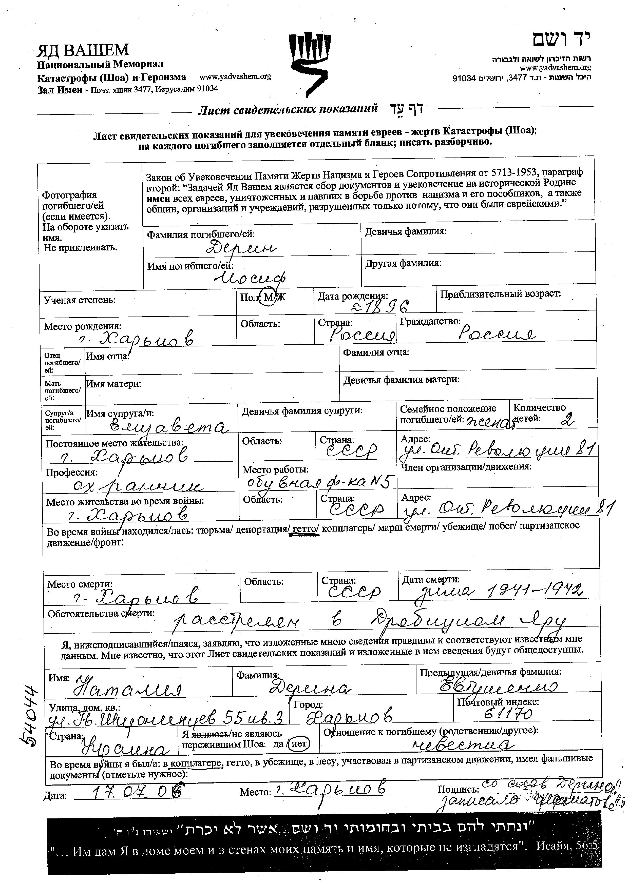 Iosif wurde in der Schoah ermordet. Todesort: Drobitskiy Yar, Massaker Ort im Jahr 01/1942.