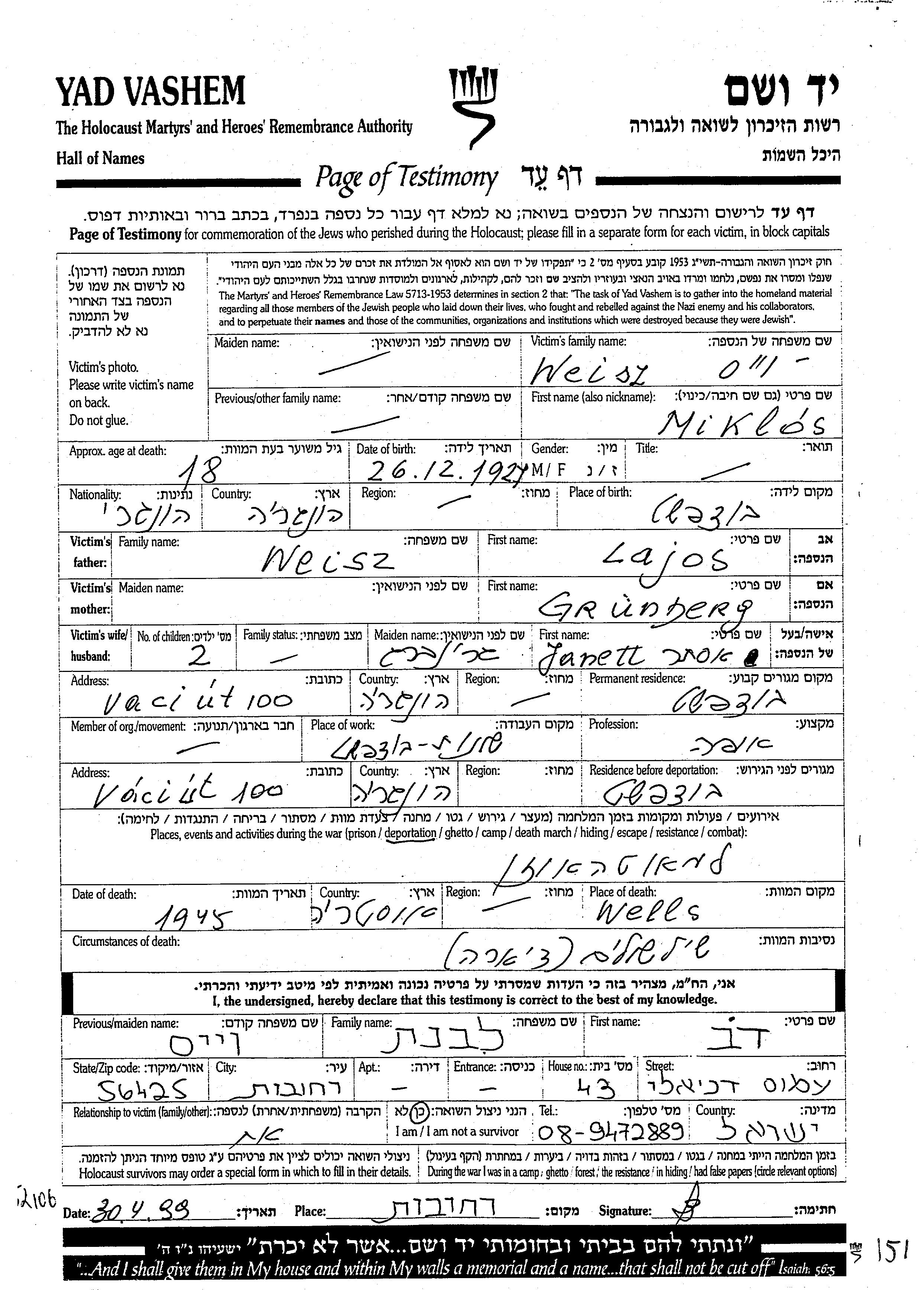Miklos wurde in der Schoah ermordet. Todesort: Mathausen, Österreich im Jahr 1945.