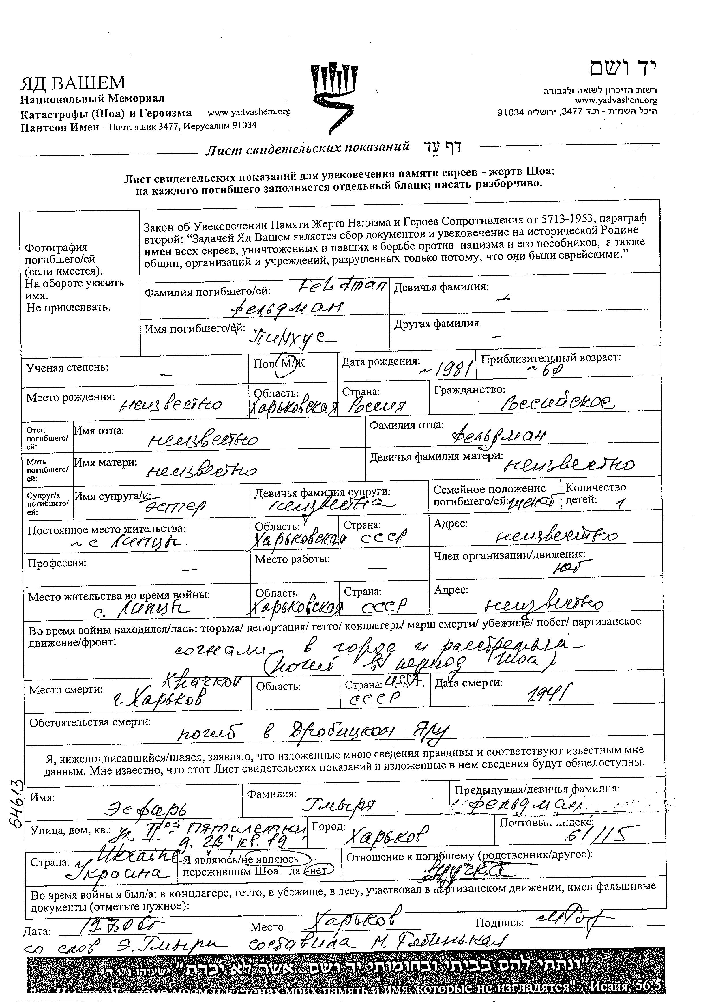 Pinkhus Feldman wurde im Jahr 1881 in Kharkov, Ukraine (UdSSR) geboren. Er war mit Ester Verheiratet. Vor dem Zweiten Weltkrieg lebte er in Liptsy, Ukraine (UdSSR). Während des Krieges war er in Liptsy, Ukraine (UdSSR).
