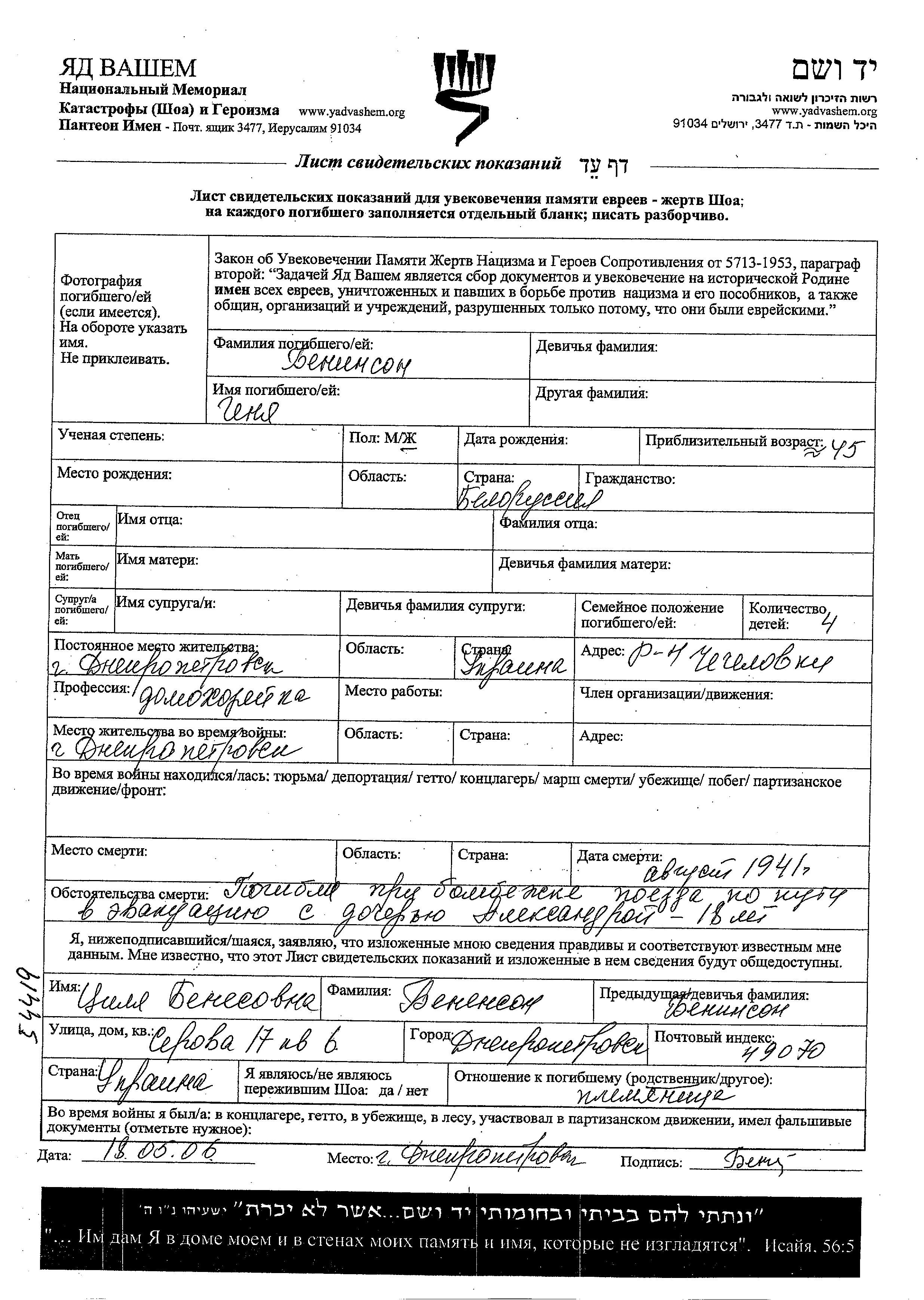 Beninson Genya Dnepropetrovsk, Ukraine (UdSSR) Gedenkblatt