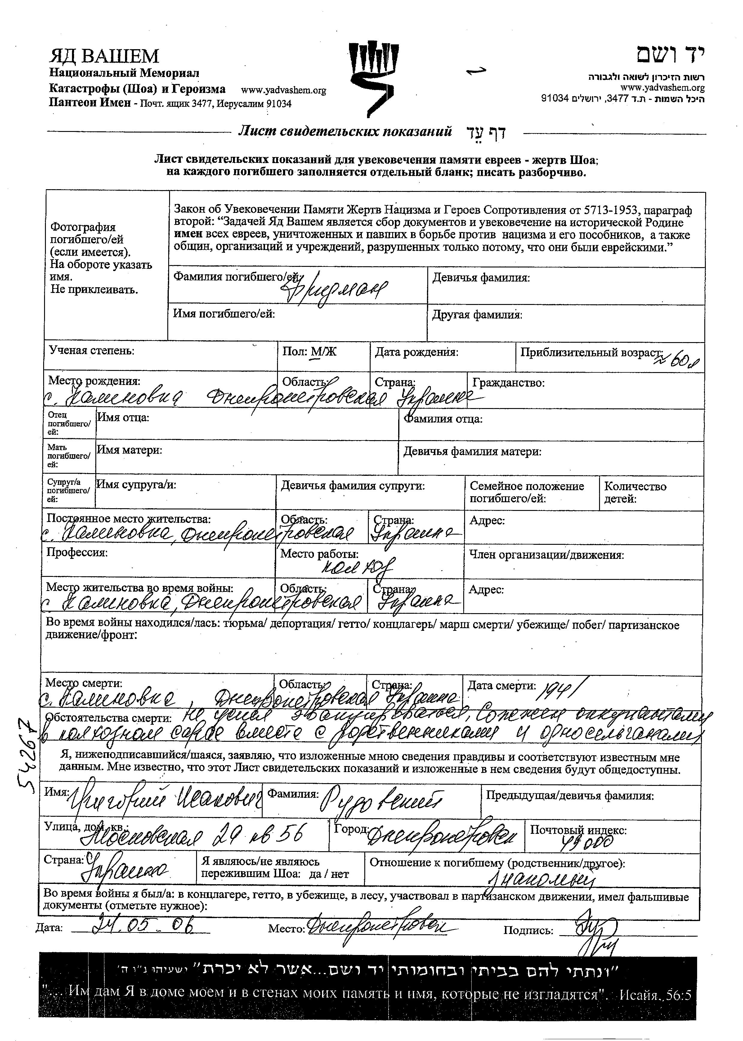 Er wurde in der Schoah ermordet. Todesort: Kalinovka, Ukraine (UdSSR) im Jahr 1941.