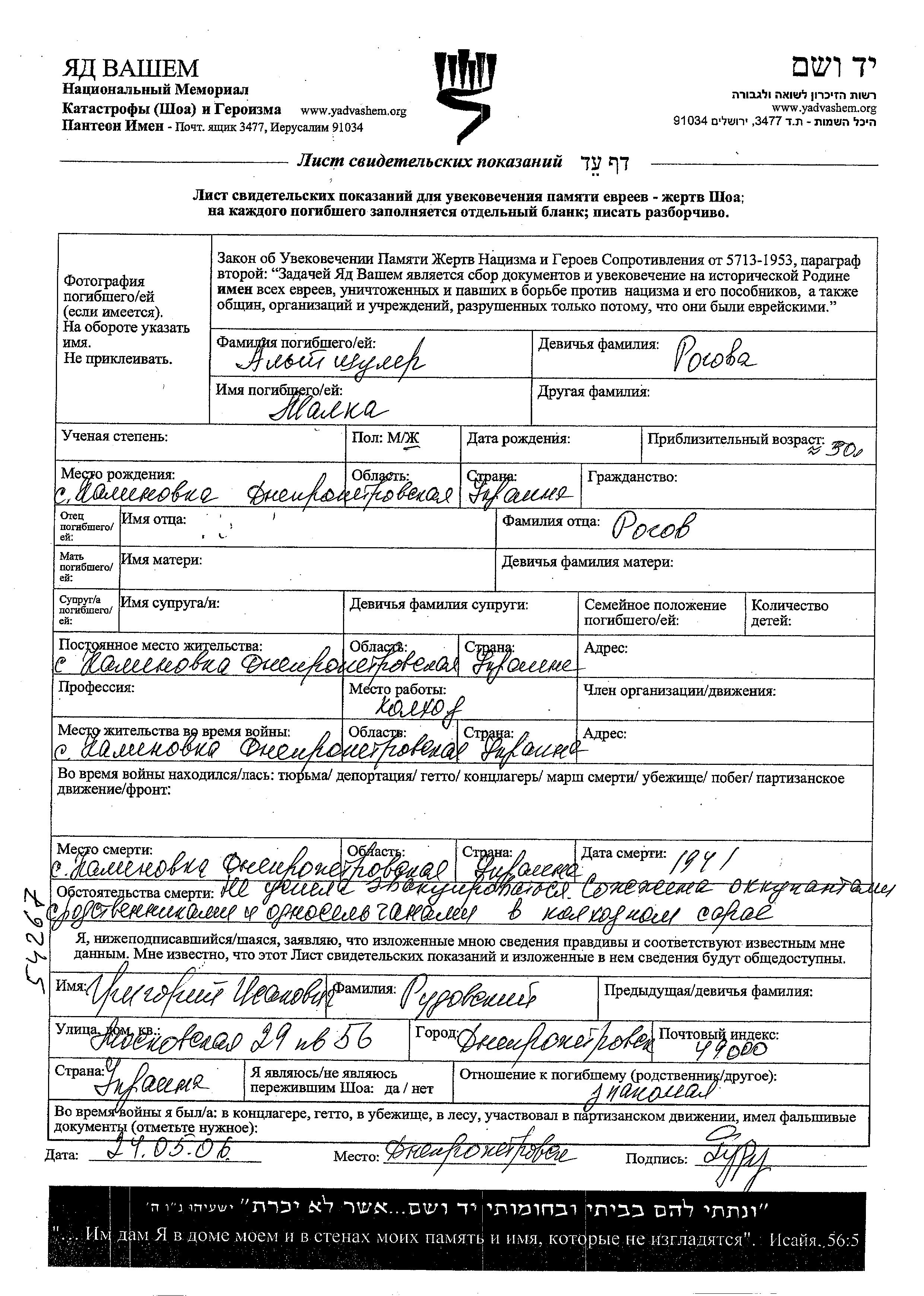 Malka Altshuler, geb. Rogova wurde in Kalinovka, Ukraine (UdSSR) geboren. Vor dem Zweiten Weltkrieg lebte sie in Kalinovka, Ukraine (UdSSR). Während des Krieges war sie in Kalinovka, Ukraine (UdSSR).