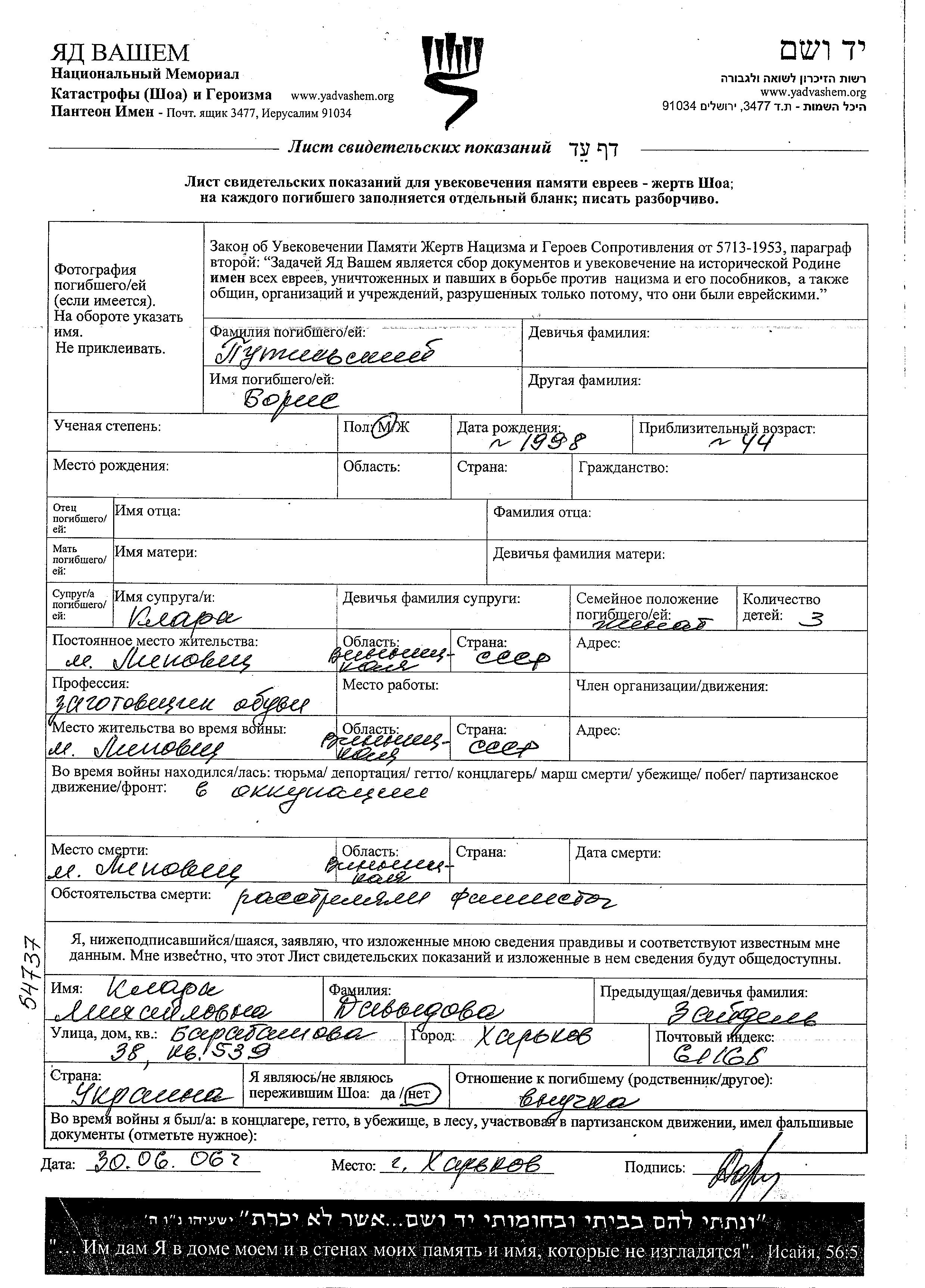 Boris wurde in der Schoah ermordet. Todesort: Lipovets, Ukraine (UdSSR).