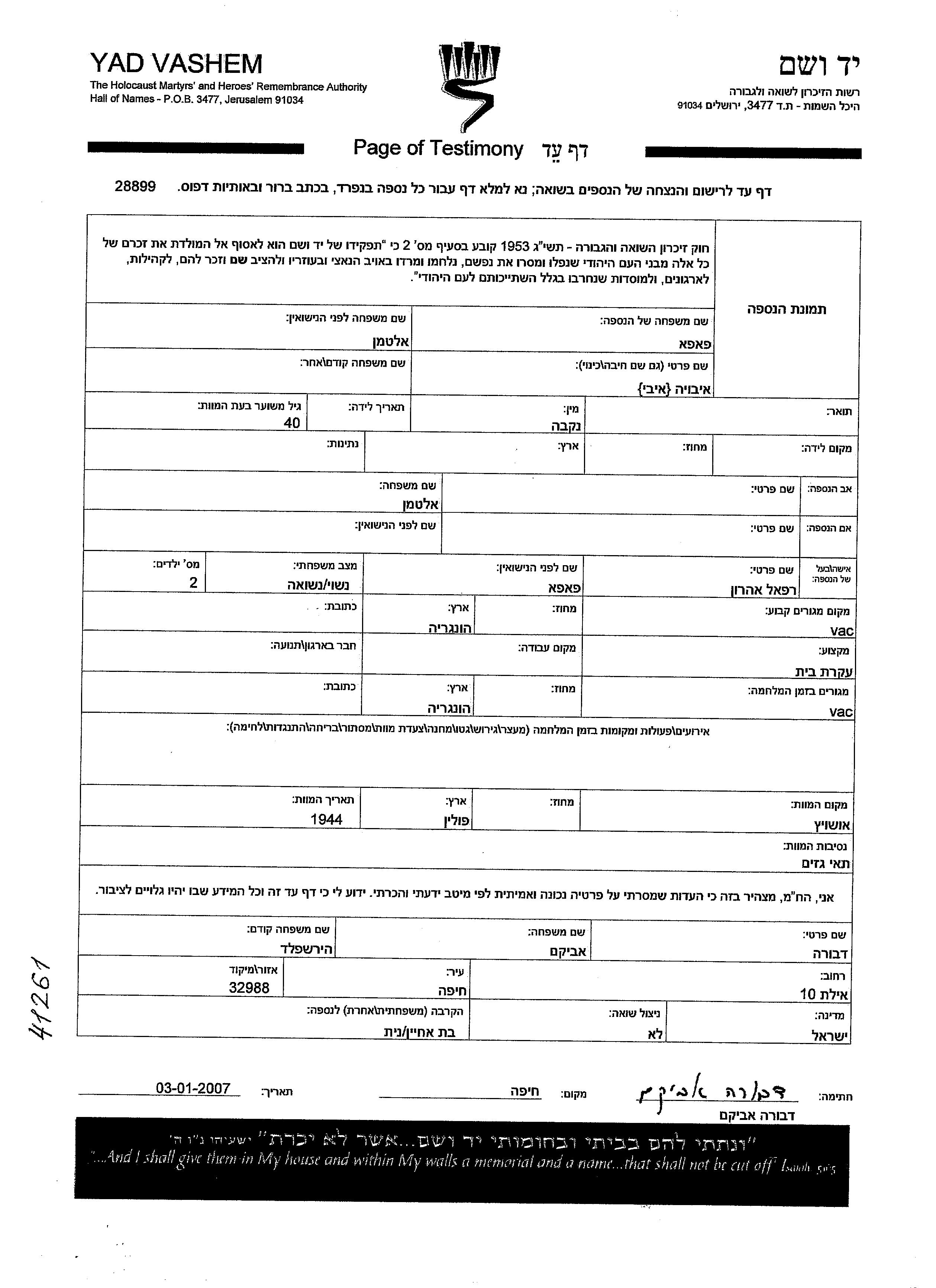 Ibi Papa, geb. Altman. Sie war Hausfrau und mit Aharon Rafael, geb. Papa Verheiratet. Vor dem Zweiten Weltkrieg lebte sie in Vac, Ungarn. Während des Krieges war sie in Vac, Ungarn.