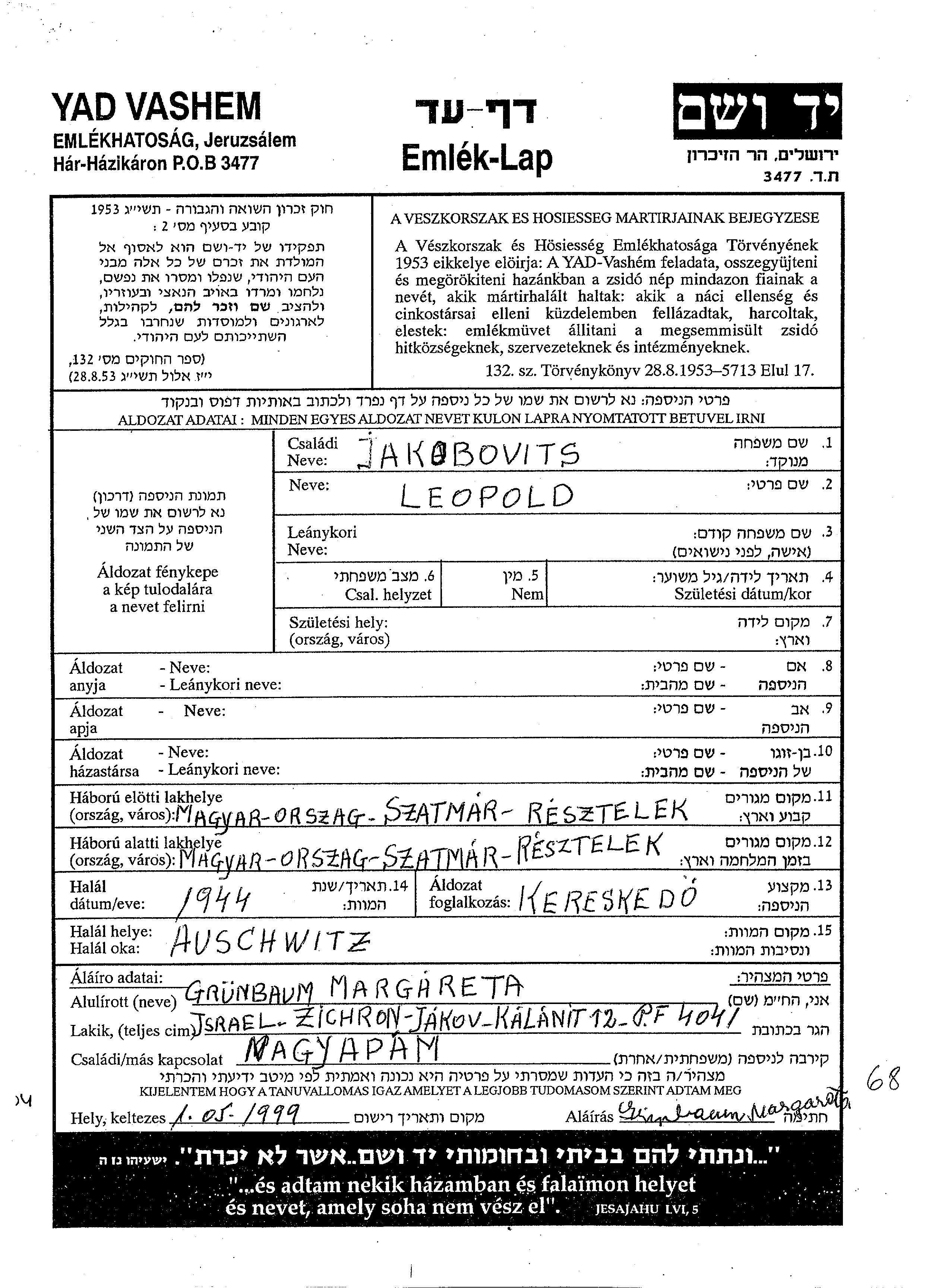 Leopold Jakobovits. Er war Kaufmann/-frau. Vor dem Zweiten Weltkrieg lebte er in Resztelek, Rumänien. Während des Krieges war er in Resztelek, Rumänien.