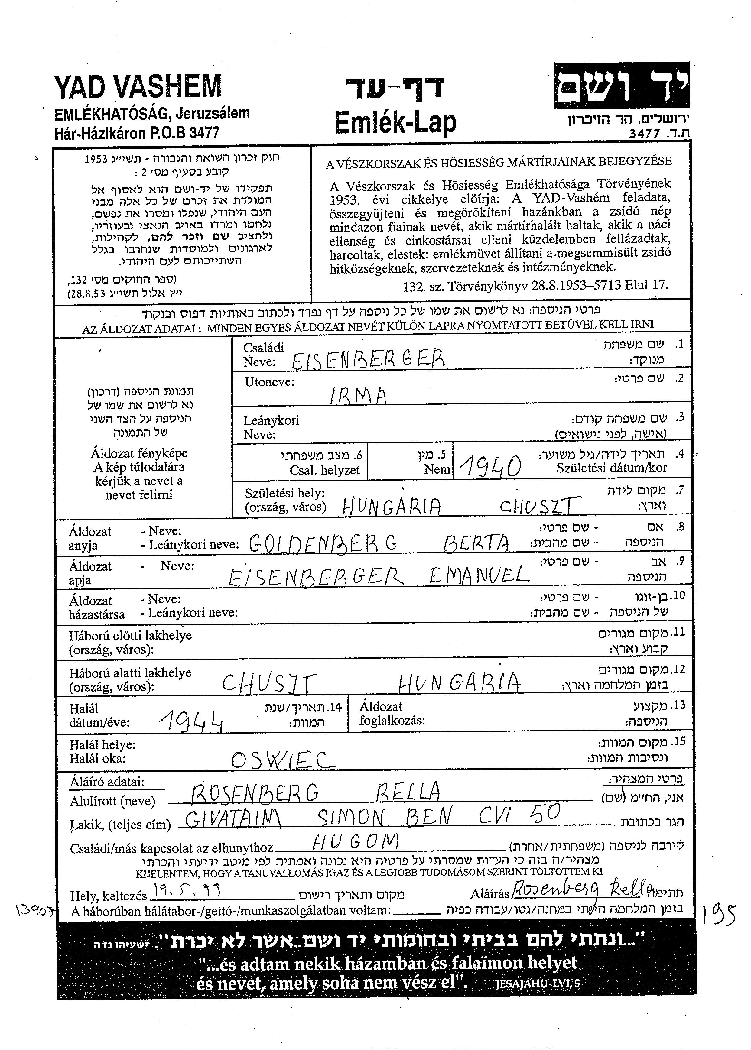 Irma Eisenberger wurde im Jahr 1940 in Chust, Tschechoslowakei geboren. Sie war die Tochter von Emanuel und Berta, geb. Goldenberg. Sie war Kind. Während des Krieges war sie in Chust District, Tschechoslowakei.