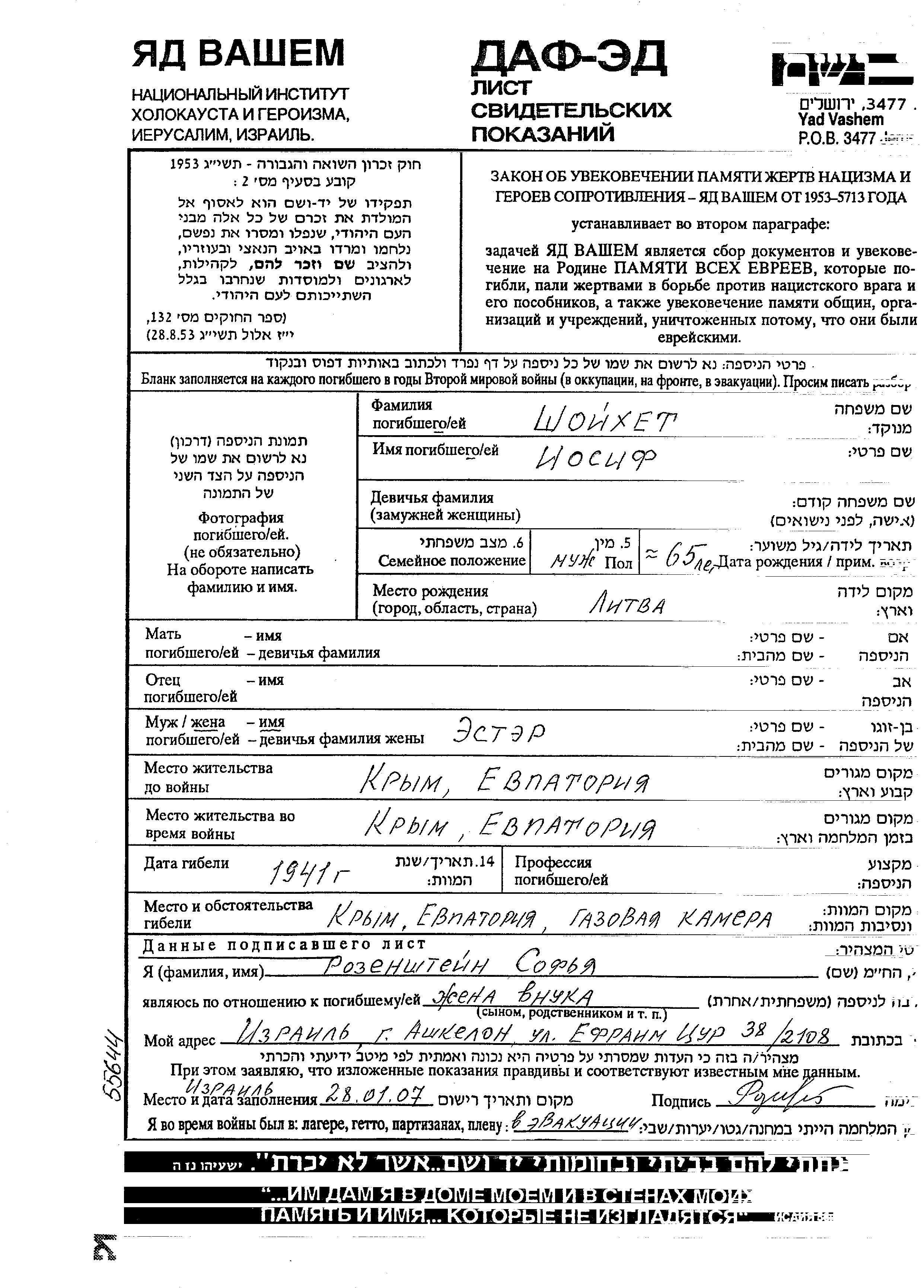 Iosif wurde in der Schoah ermordet. Todesort: Yevpatoriya, Russland (UdSSR) im Jahr 1941.