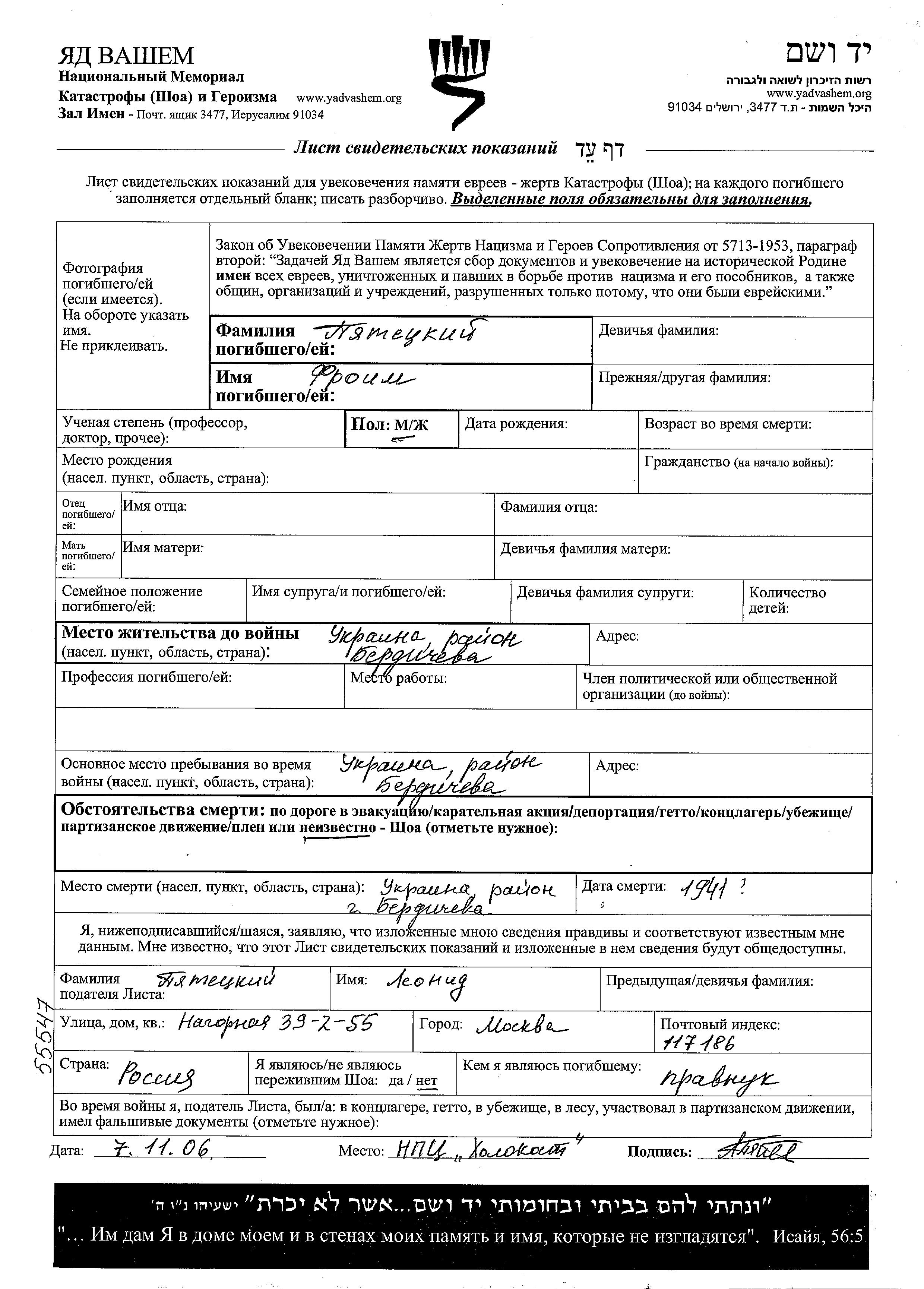 Froim Pyatetzki. Vor dem Zweiten Weltkrieg lebte er in Berdichev, Ukraine (UdSSR). Während des Krieges war er in Berdichev, Ukraine (UdSSR).