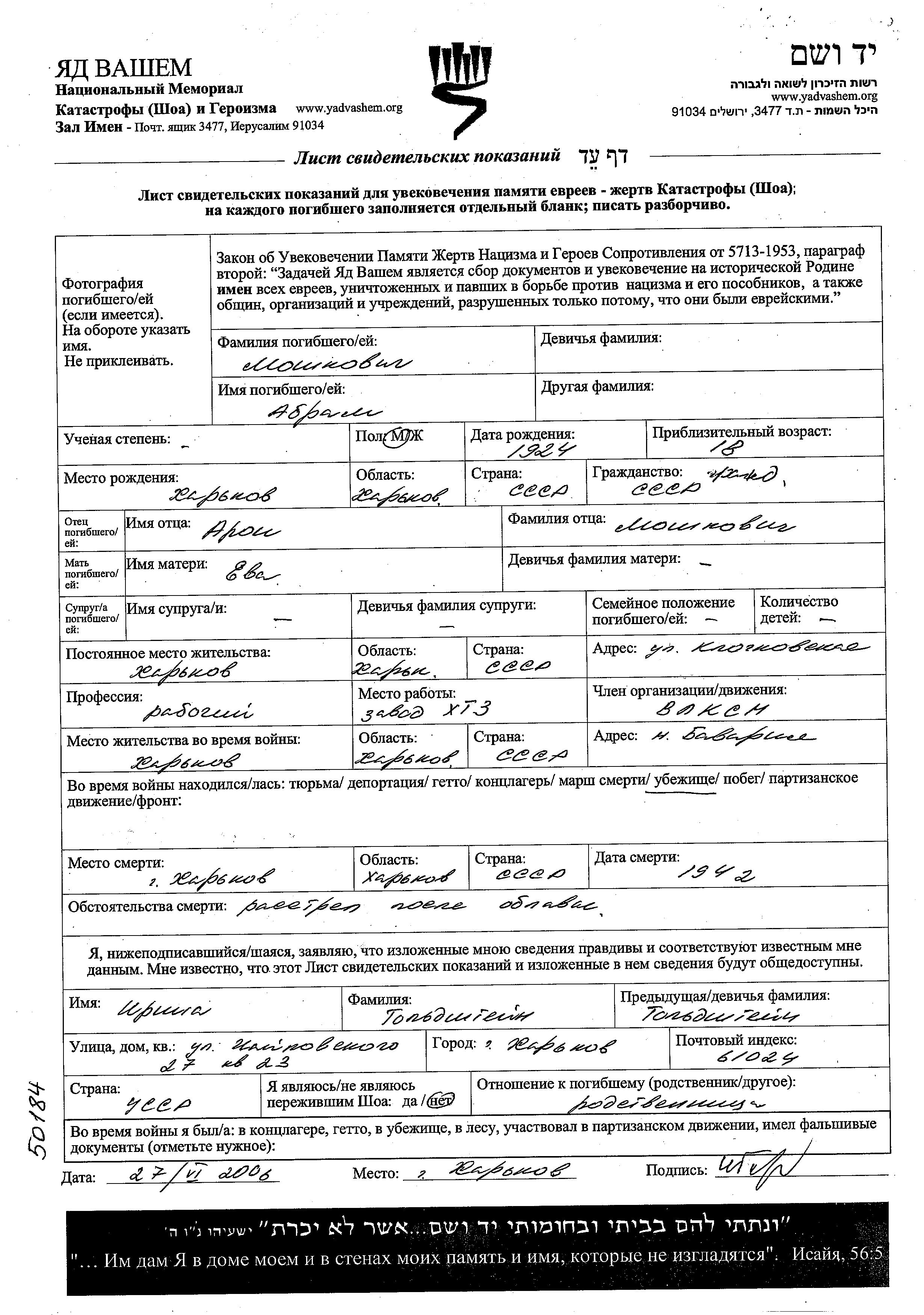 Abram Moshkovich wurde im Jahr 1924 in Kharkov, Ukraine (UdSSR) geboren. Er war der Sohn von Aron und Yeva. Er war Fabrikarbeiter / fabrikarbeiterin und Ledig. Vor dem Zweiten Weltkrieg lebte er in Kharkov, Ukraine (UdSSR). Während des Krieges war er in Kharkov, Ukraine (UdSSR).