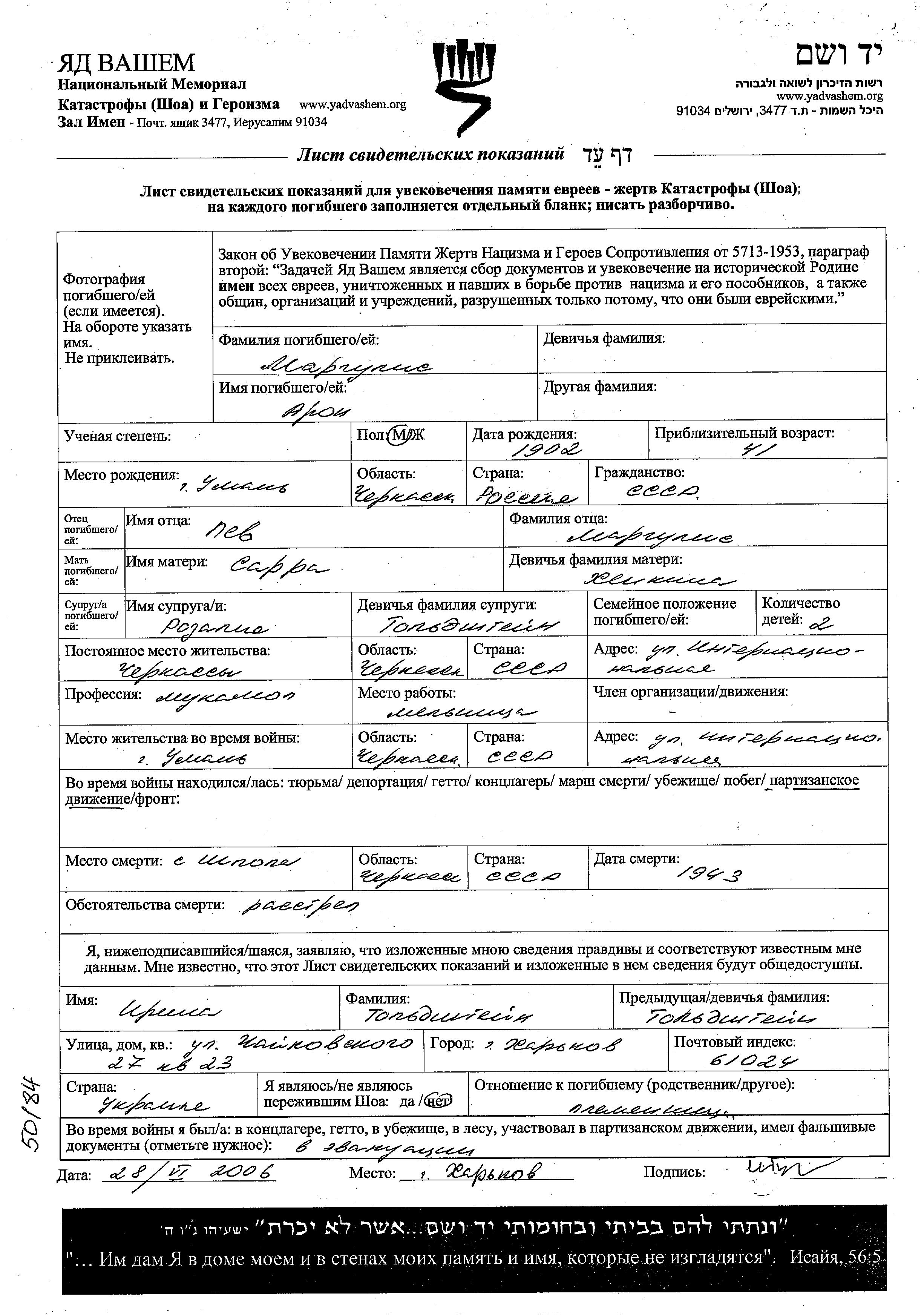 Margulis Aron 1902 Cherkassy, Ukraine (UdSSR) Gedenkblatt