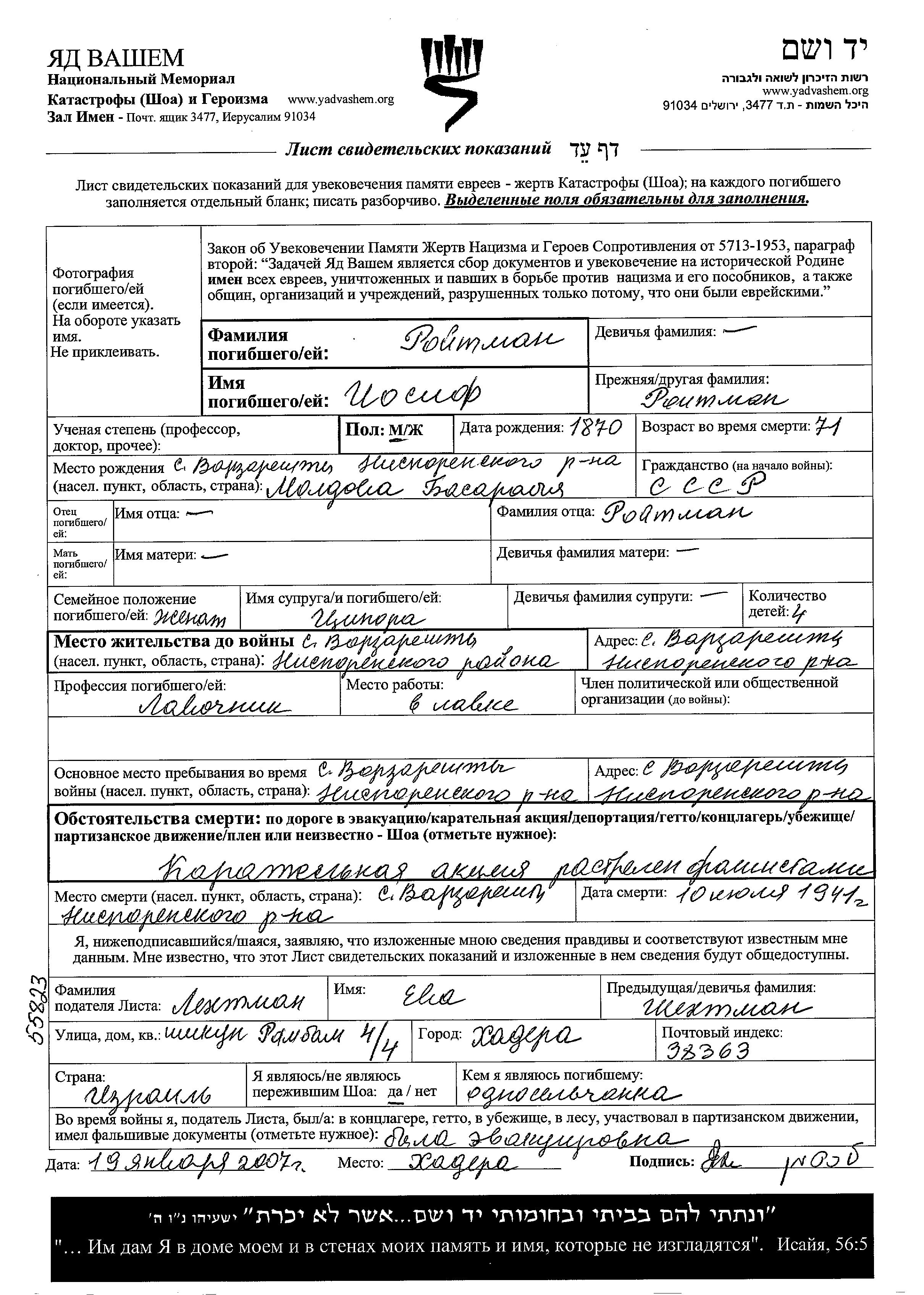 Iosif wurde in der Schoah ermordet. Todesort: Varzareshty, Rumänien im Jahr 10/07/1941.