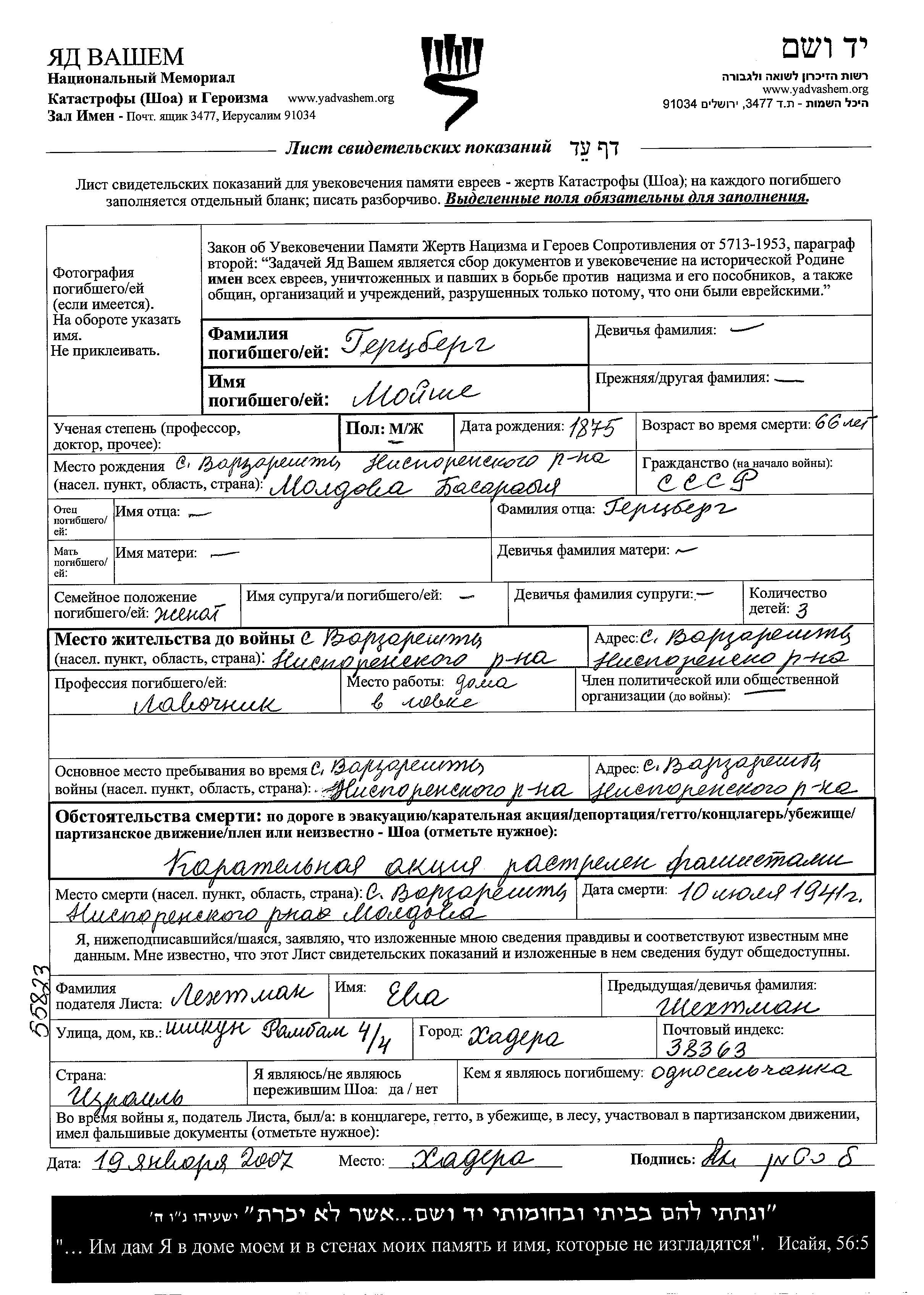Moishe wurde in der Schoah ermordet. Todesort: Varzaresti, Rumänien im Jahr 10/07/1941.