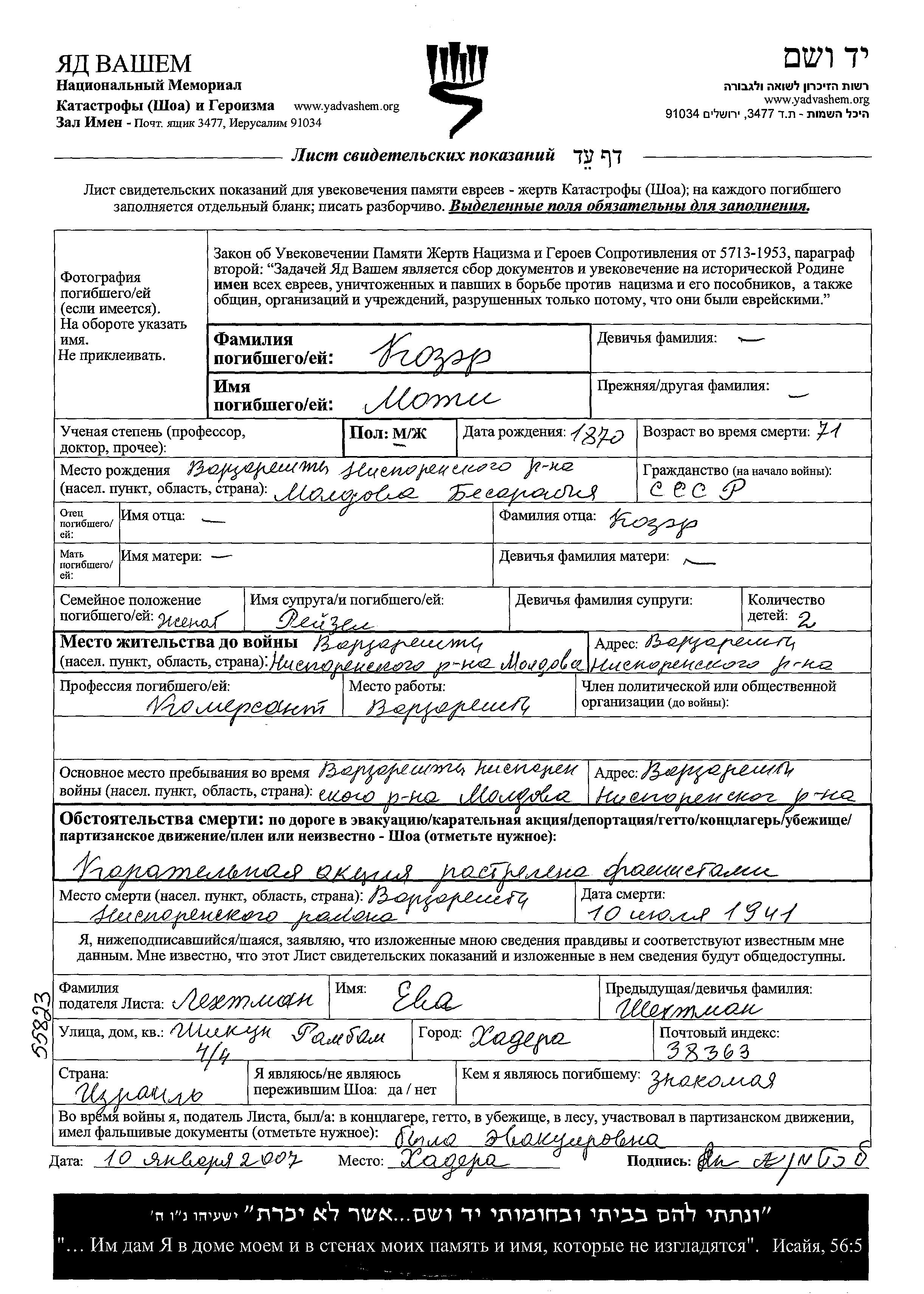 Moti Kozer wurde im Jahr 1870 in Varzaresti, Rumänien geboren. Er war Kaufmann/-frau und mit Reizel Verheiratet. Vor dem Zweiten Weltkrieg lebte er in Varzaresti, Rumänien. Während des Krieges war er in Varzaresti, Rumänien.