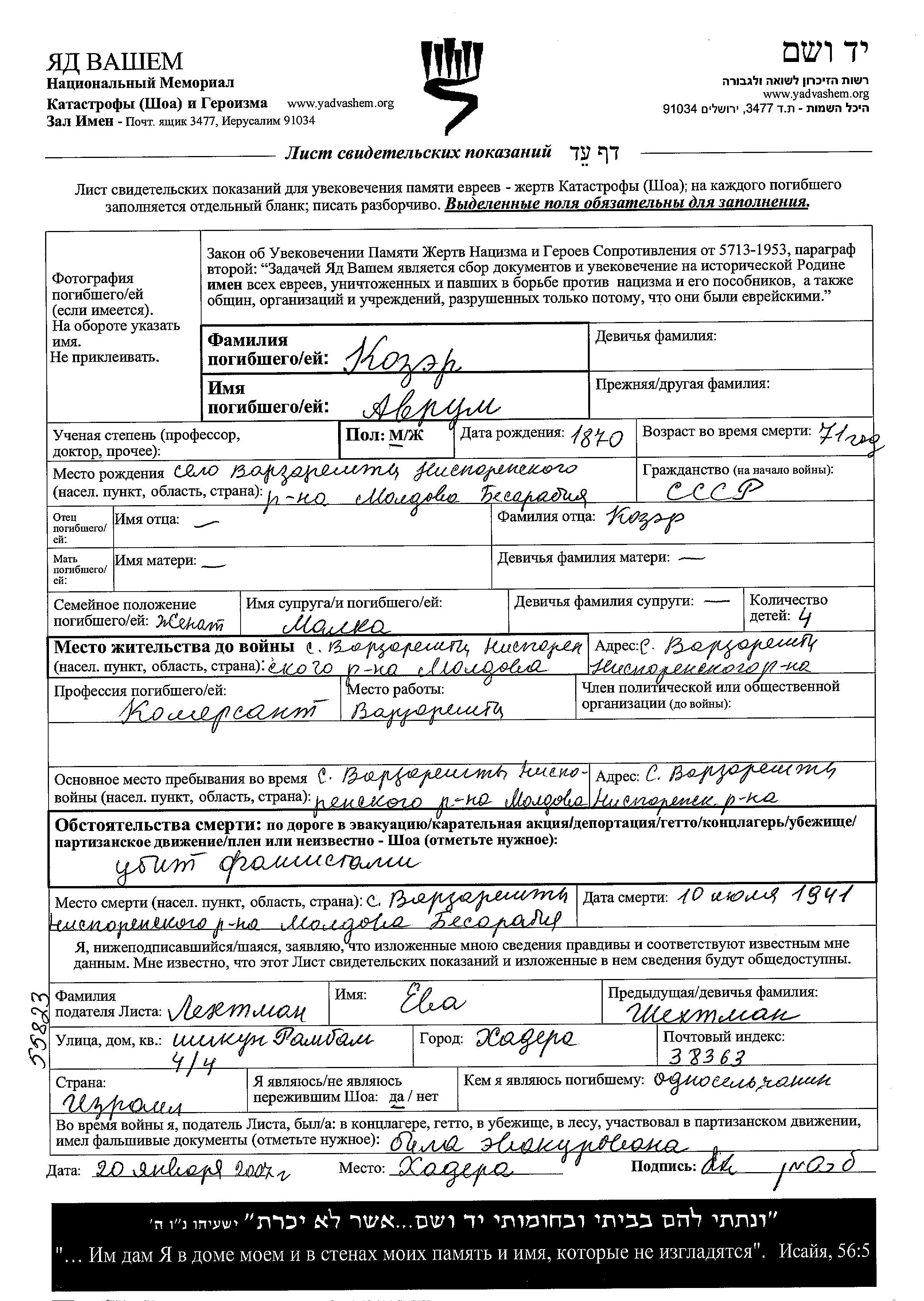 Avrum wurde in der Schoah ermordet. Todesort: Varzareshty, Rumänien im Jahr 10/07/1941.