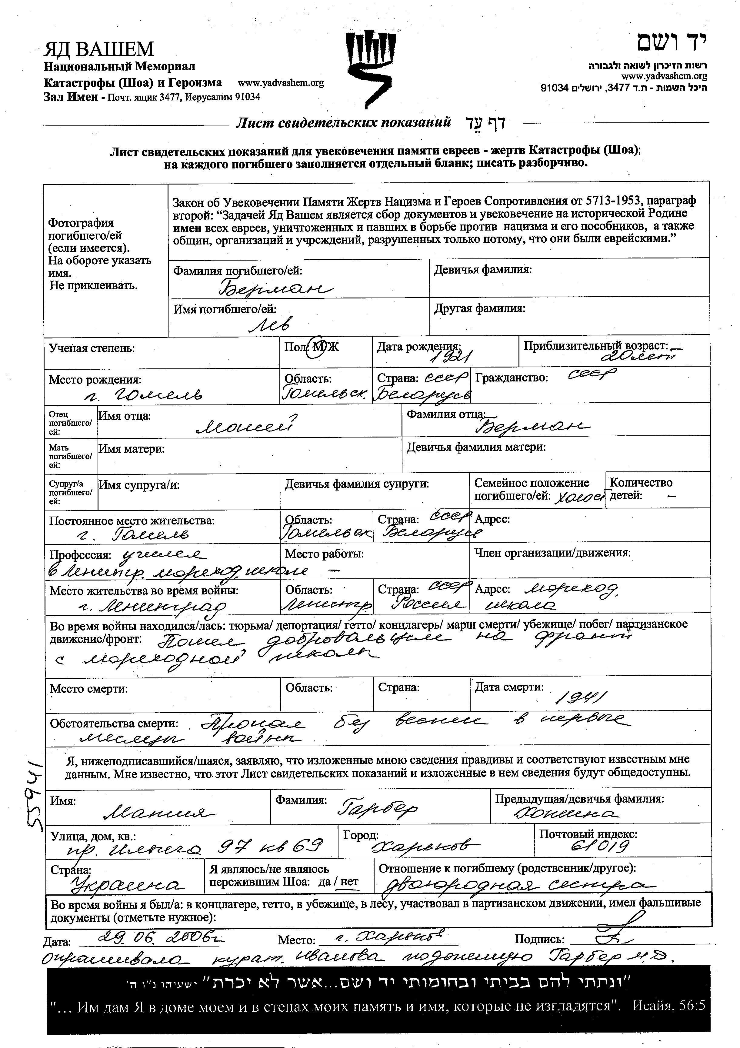 Berman Lev 1921 Gomel, Weißrussland (UdSSR) Gedenkblatt