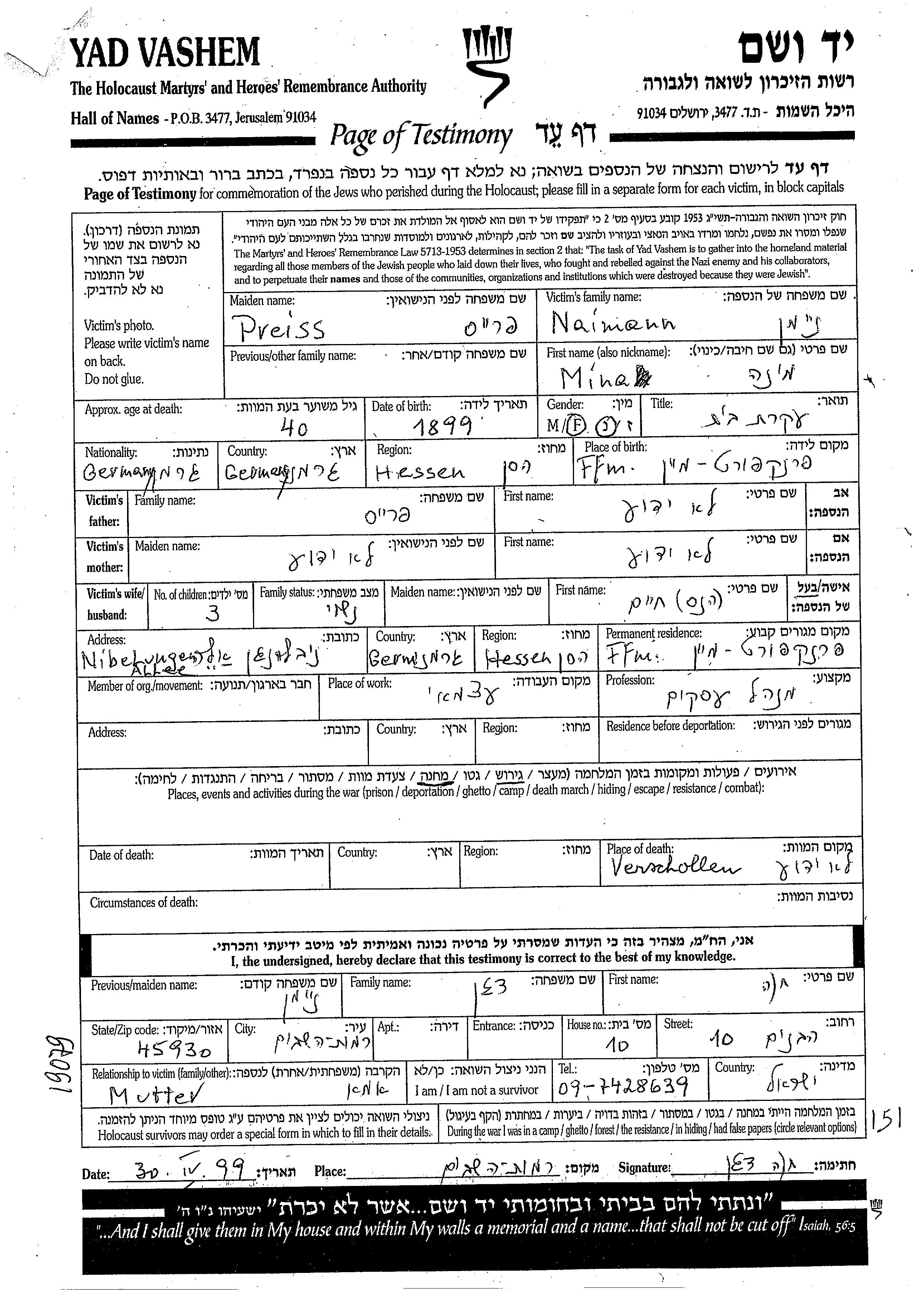 Mina Neiman, geb. Preis wurde im Jahr 1899 in Frankfurt am Main, Deutsches Reich geboren. Sie war Fachwirt und mit Hans Khaim Verheiratet. Vor dem Zweiten Weltkrieg lebte sie in Frankfurt am Main, Deutsches Reich.
