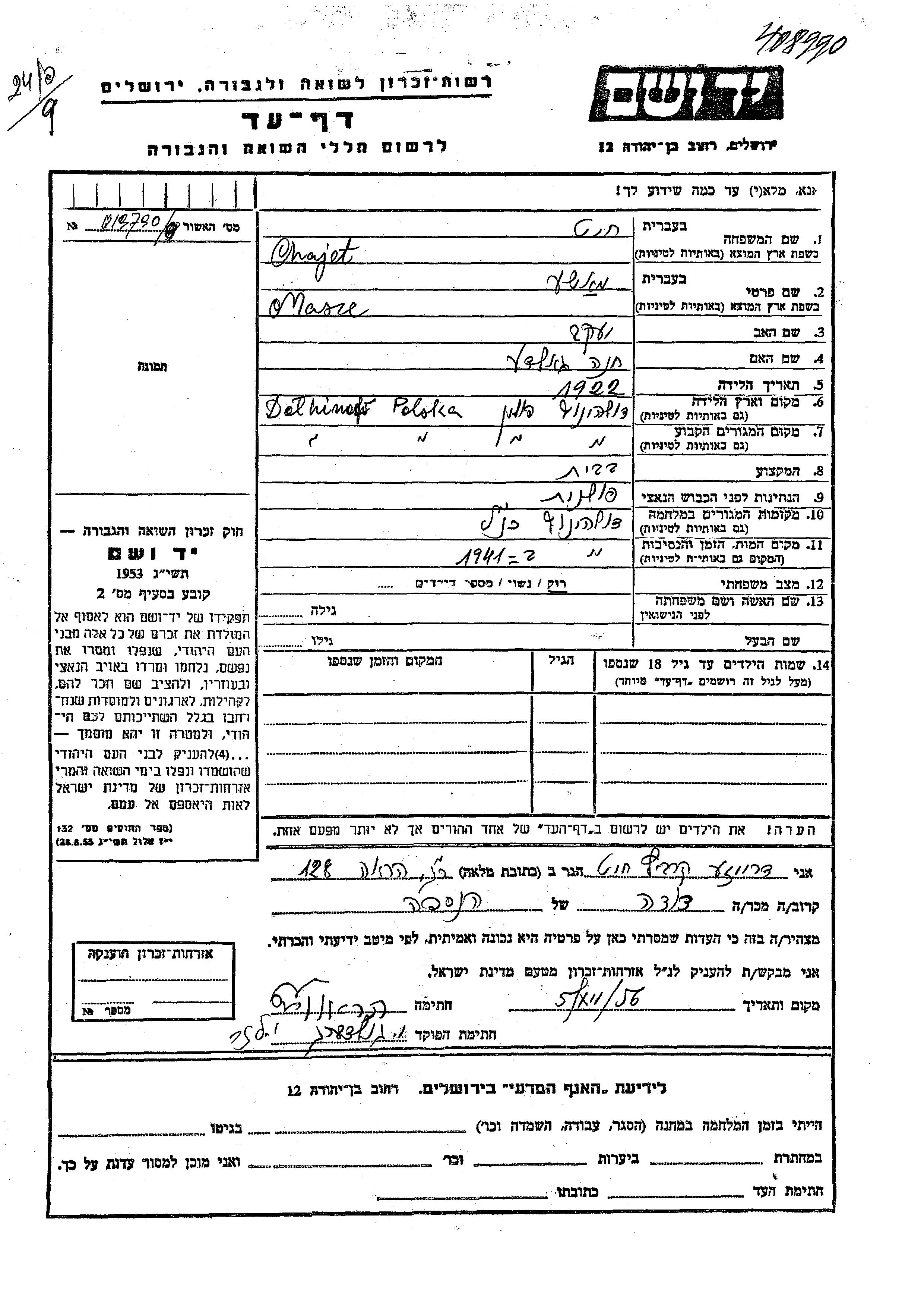 Masze Mashe Chajet wurde im Jahr 1922 in Dolhinov, Polen geboren. Er/sie war der/ die Sohn/Tochter von Yaakov und Khana Golde. Er/Sie war Hausfrau und Ledig. Vor dem Zweiten Weltkrieg er/sie in Dolhinov, Polen. Während des Krieges war er/sie in Dolhinov, Polen.