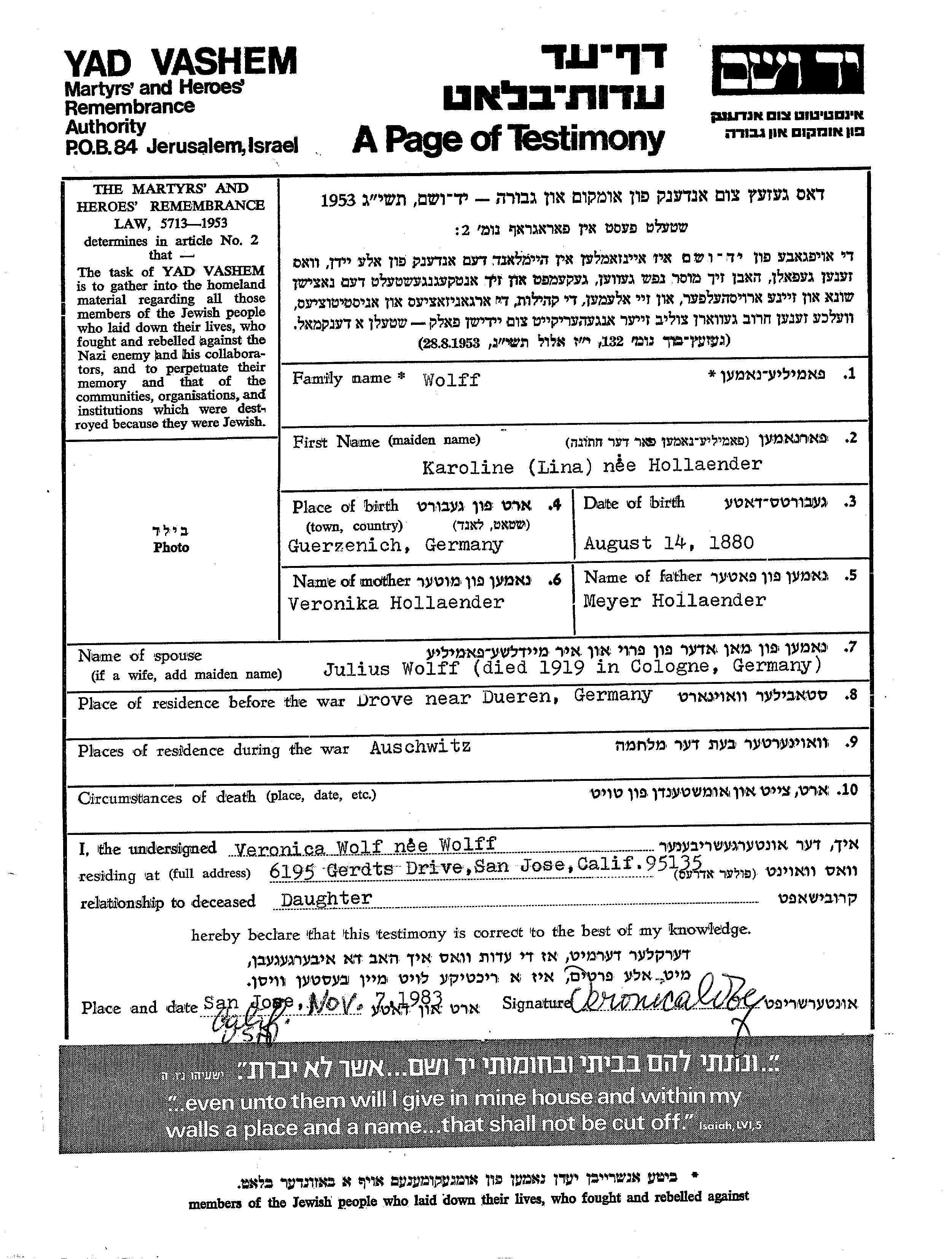 Karoline Lina Wolf, geb. Holländer wurde im Jahr 1880 in Guerzenich, Deutsches Reich geboren. Sie war die Tochter von Meyer und Veronika. Sie war mit Julius Verheiratet. Vor dem Zweiten Weltkrieg lebte sie in Drove ueber Dueren, Deutsches Reich. Während des Krieges war sie in Auschwitz, Polen.