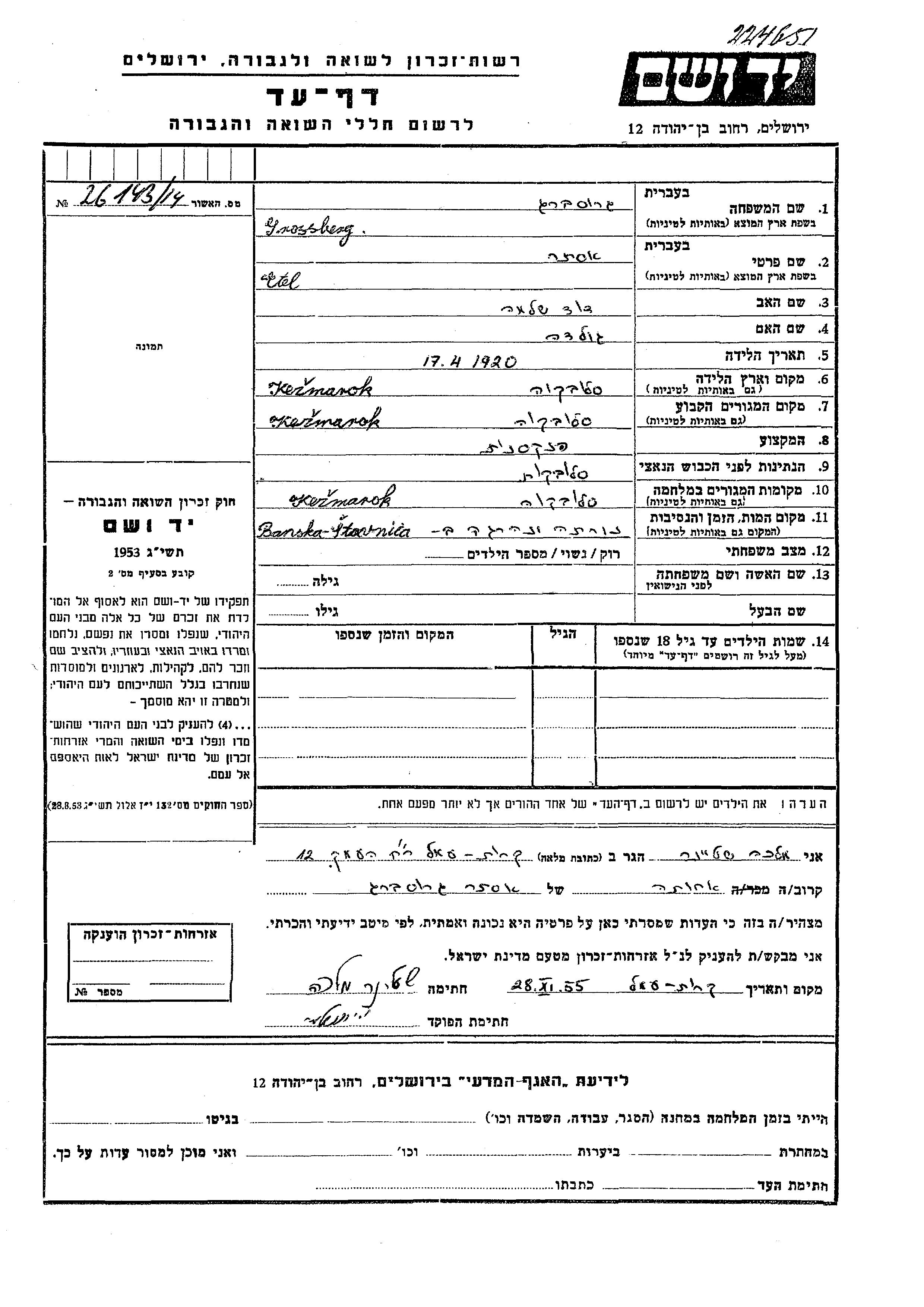 Etel wurde in der Schoah ermordet. Todesort: Banska Stavnica, Tschechoslowakei.