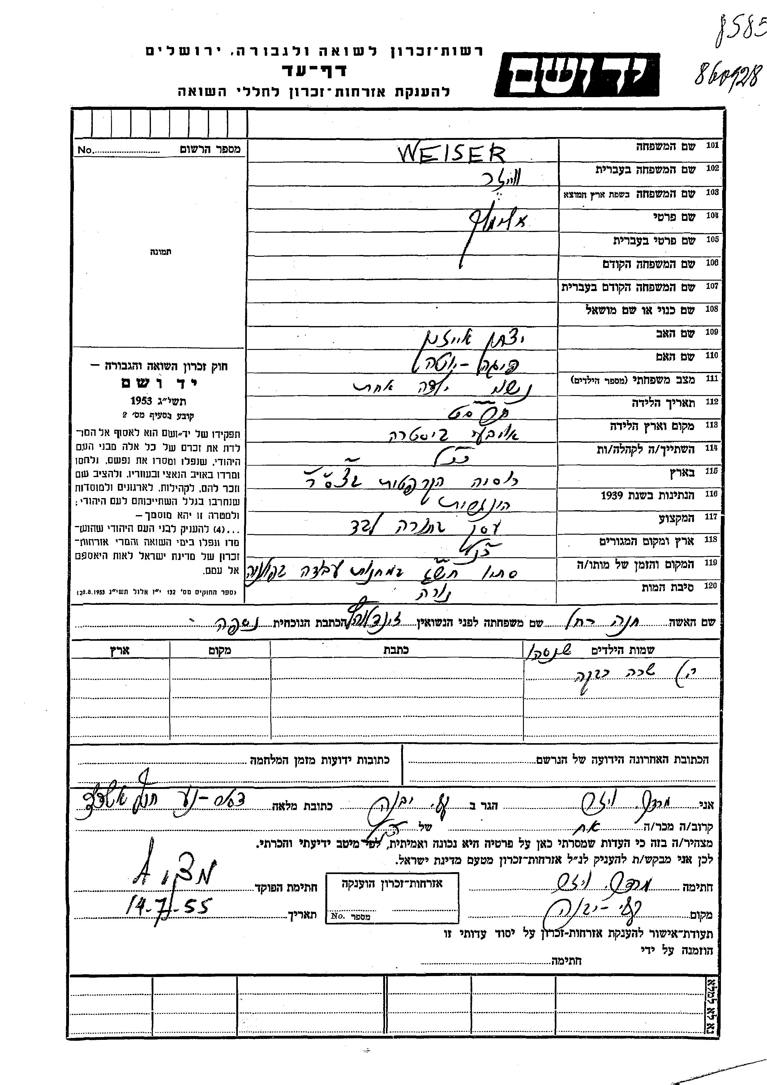 Elimelekh Weiser wurde im Jahr 1908 in Bisztra, Tschechoslowakei geboren. Er war der Sohn von Yitzkhak und Feiga Yuta. Er war Toragelehrter und mit Khana Rakhel, geb. Zandelovitz Verheiratet. Vor dem Zweiten Weltkrieg lebte er in Bisztra, Tschechoslowakei.