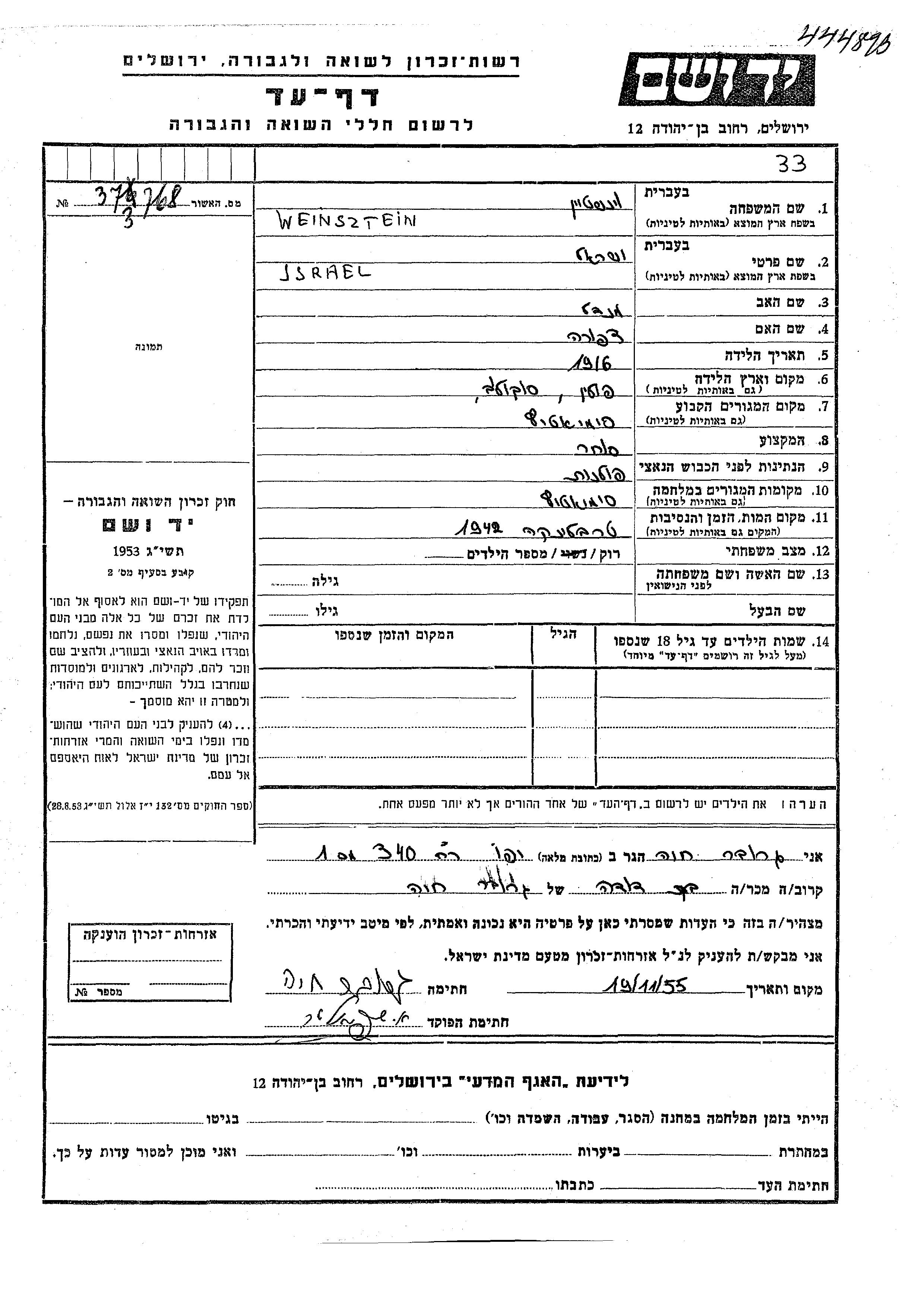Israel Weinsztein wurde im Jahr 1916 in Sokolow, Polen geboren. Er war der Sohn von Mendel und Tzipora. Er war Kaufmann/-frau und Ledig. Vor dem Zweiten Weltkrieg lebte er in Simiatic, Polen. Während des Krieges war er in Simiatic, Polen.