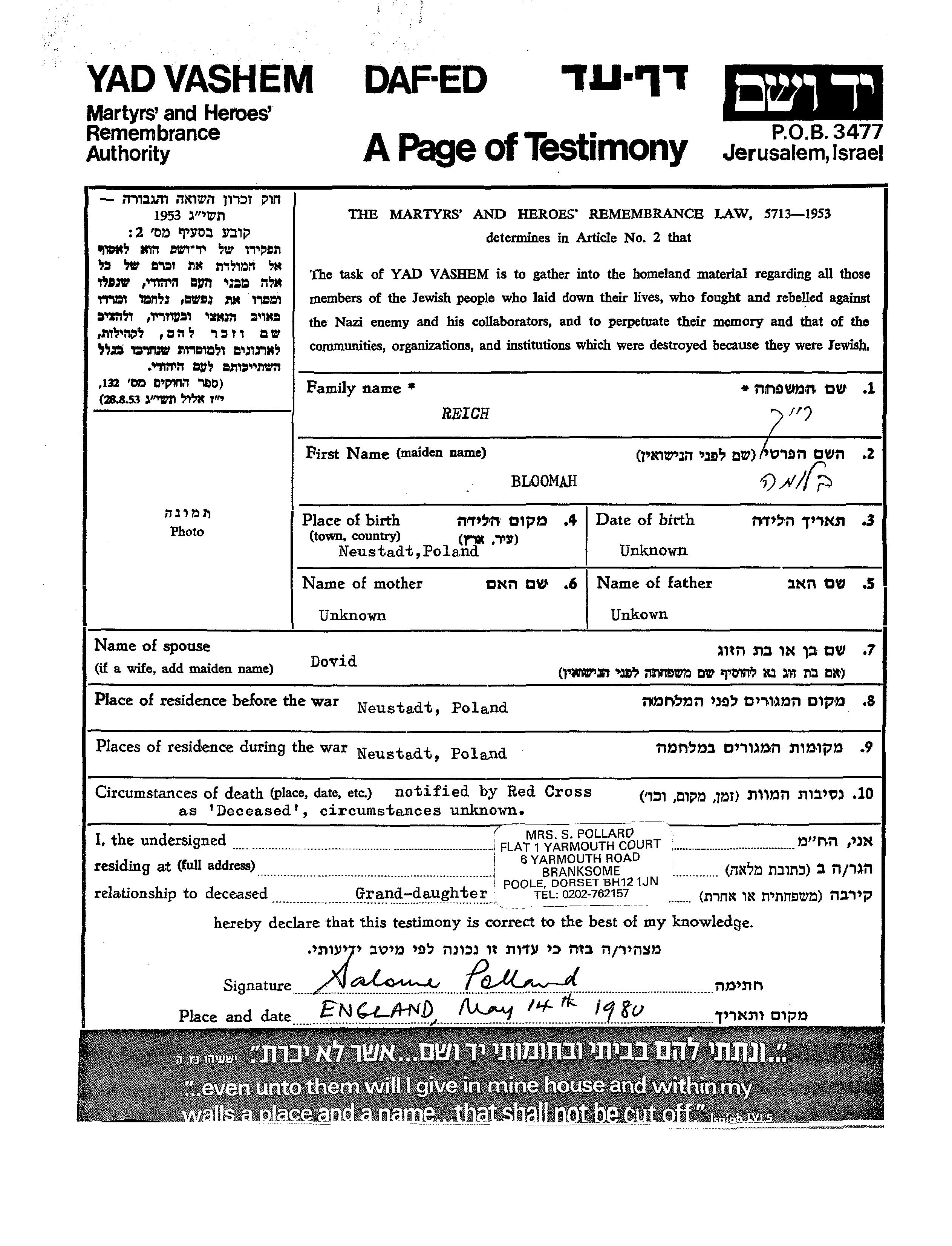 Bloomah Reich wurde in Neustadt, Polen geboren. Vor dem Zweiten Weltkrieg lebte sie in Neustadt, Polen. Während des Krieges war sie in Neustadt, Polen.