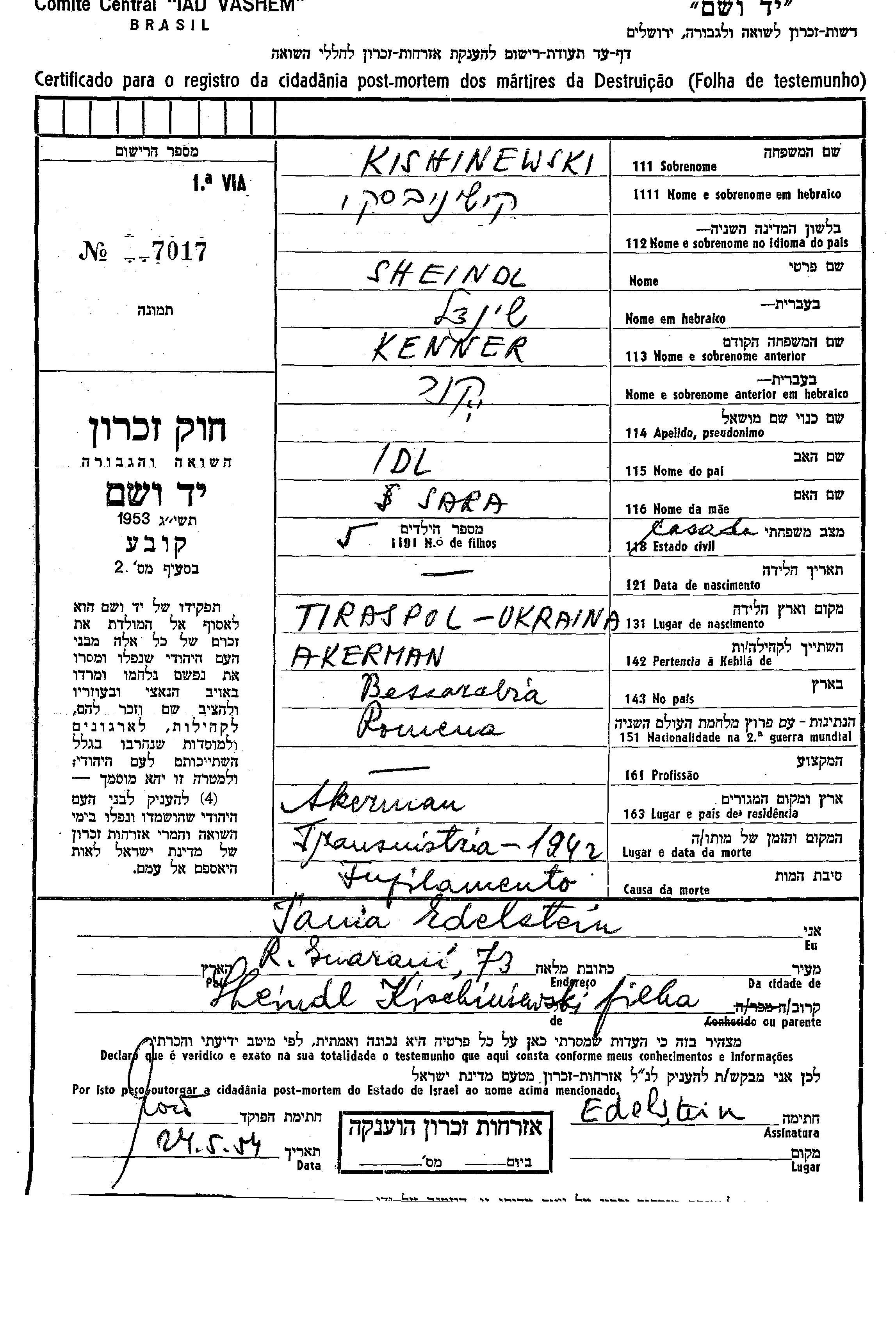 Sheindl Kishinewski, geb. Kenner Kaner wurde Sie war die Tochter von Idl und Sara. Sie war Verheiratet. Vor dem Zweiten Weltkrieg lebte sie in Akerman, Rumänien. Während des Krieges war sie in Transnistria, Ukraine (UdSSR).