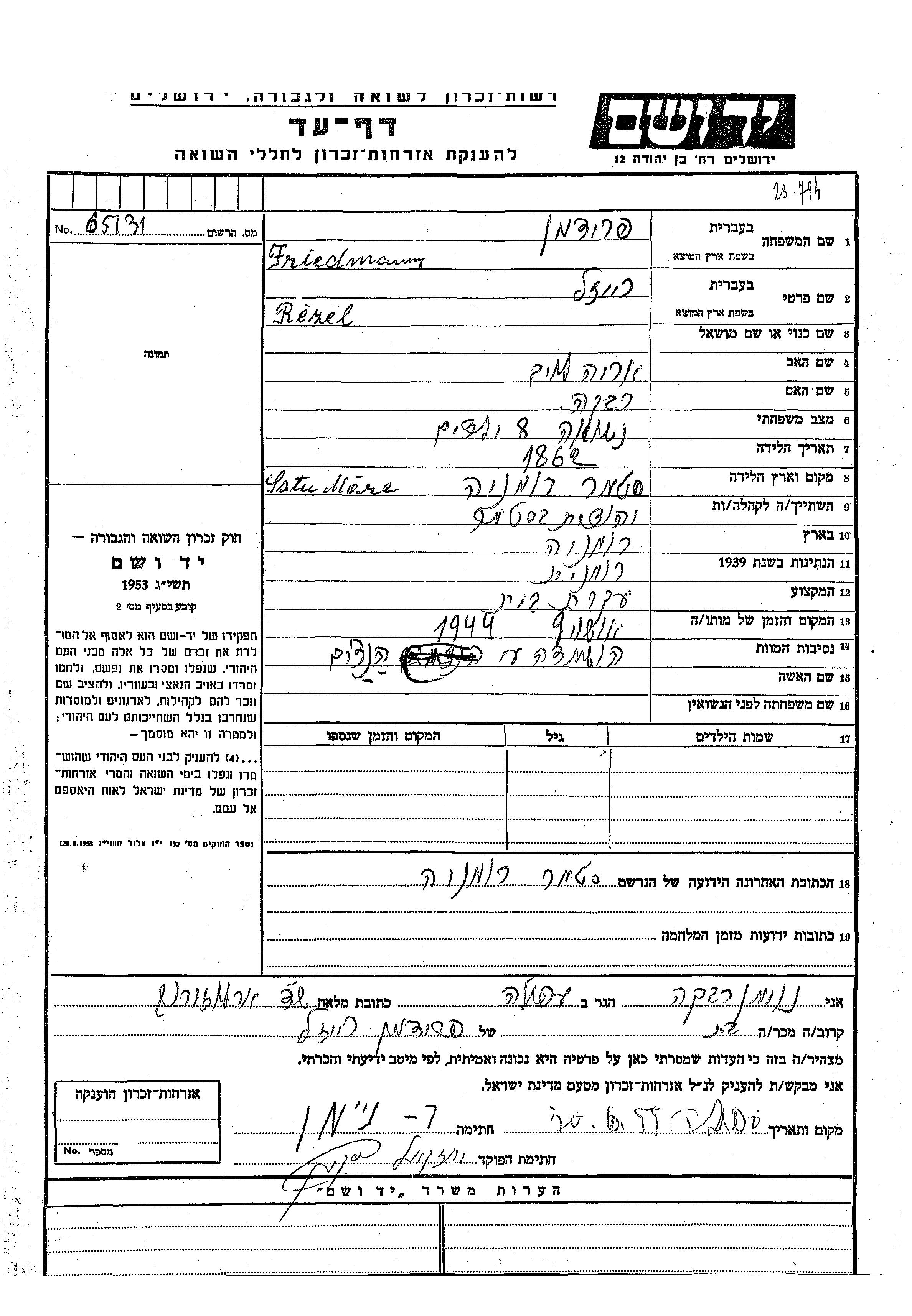 Reizl Friedman wurde im Jahr 1862 in Satu Mare, Rumänien geboren. Sie war die Tochter von Arie Leib und Rivka. Sie war Verheiratet. Vor dem Zweiten Weltkrieg lebte sie in Satu Mare, Rumänien. Während des Krieges war sie in Satu Mare, Rumänien.