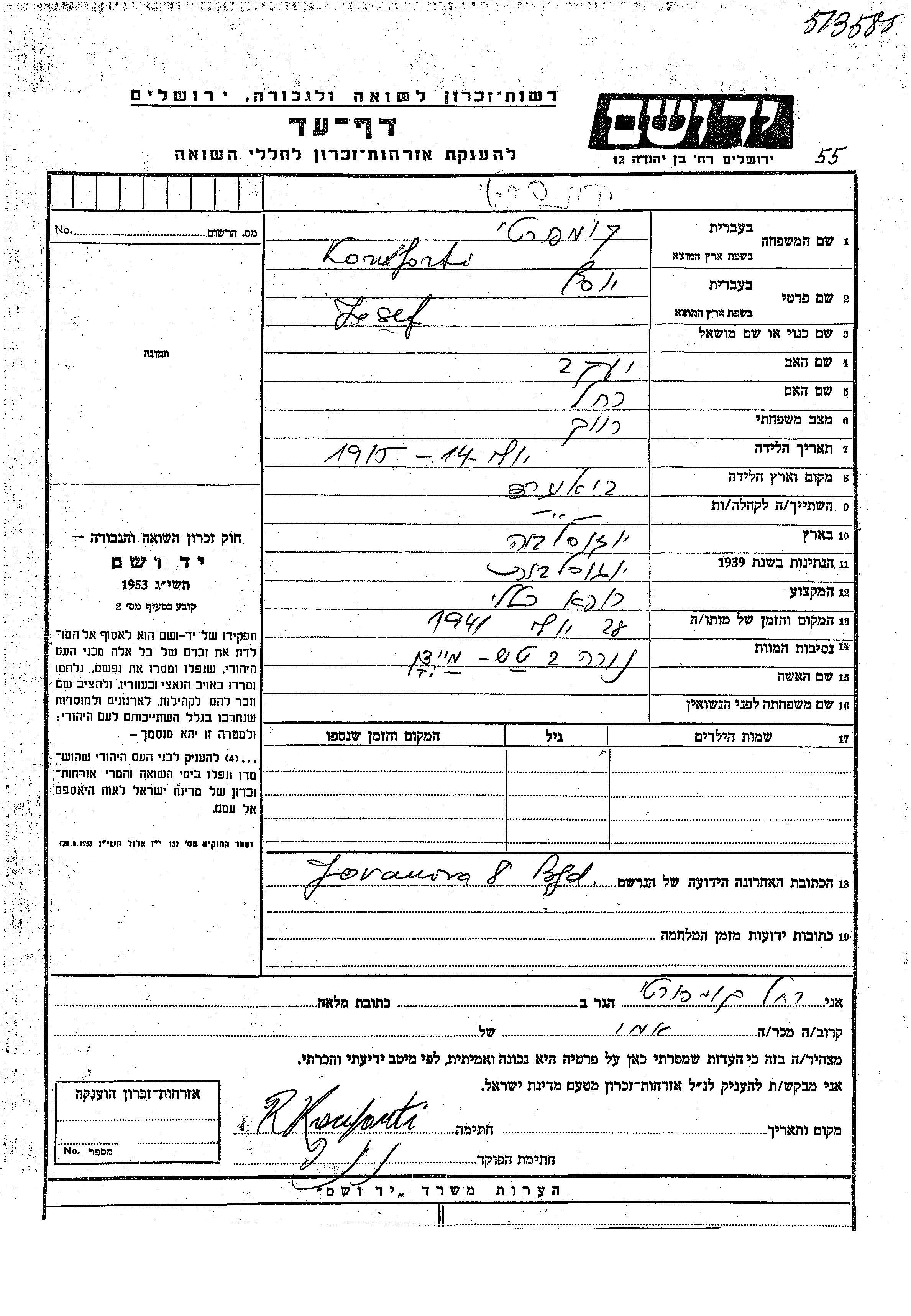 Josef Komforti wurde im Jahr 1915 in Beograd, Jugoslawien geboren. Er war der Sohn von Yaakov und Rakhel. Er war Arzt für allgemeinmedizin und Ledig. Vor dem Zweiten Weltkrieg lebte er in Beograd, Jugoslawien. Während des Krieges war er in Beograd, Jugoslawien.