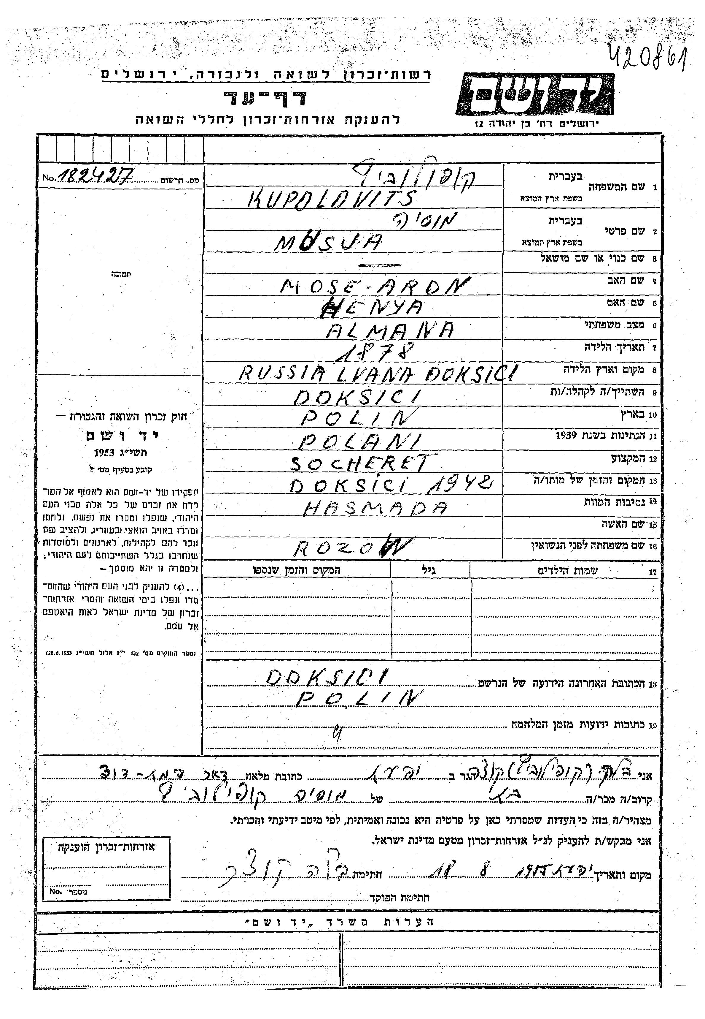 Musja Kupolovits, geb. Rozow wurde im Jahr 1878 geboren. Sie war die Tochter von Mose Aron und Henya. Sie war Kaufmann/-frau und Witwe. Vor dem Zweiten Weltkrieg lebte sie in Dokshits, Polen. Während des Krieges war sie in Polen.