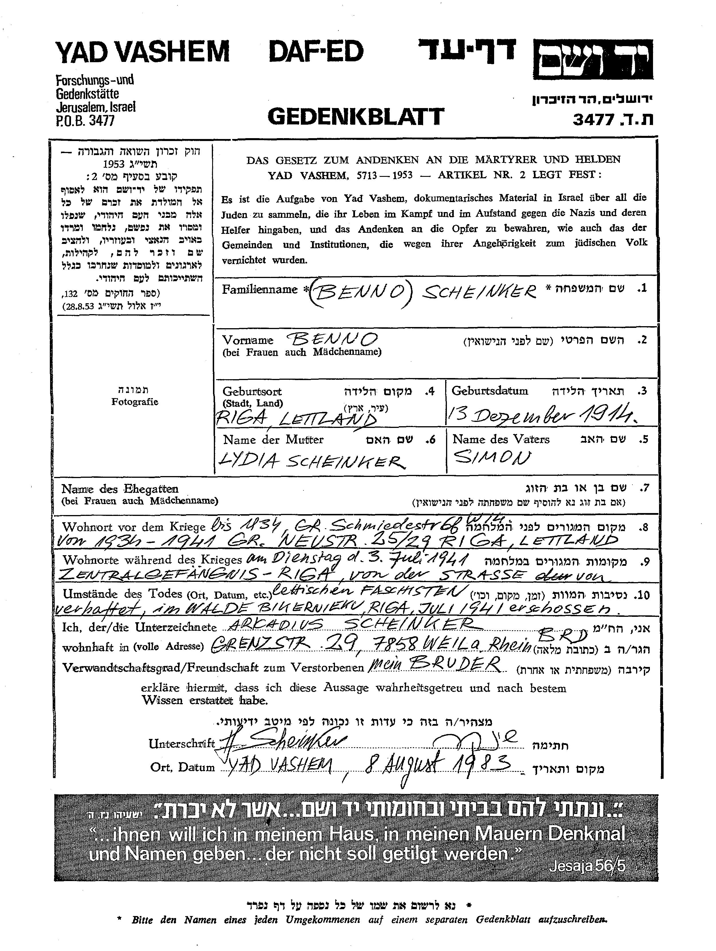 Benno Scheinker wurde im Jahr 1914 in Riga, Lettland geboren. Er war der Sohn von Simon und Lydia. Vor dem Zweiten Weltkrieg lebte er in Riga, Lettland. Während des Krieges war er in Riga, Lettland.