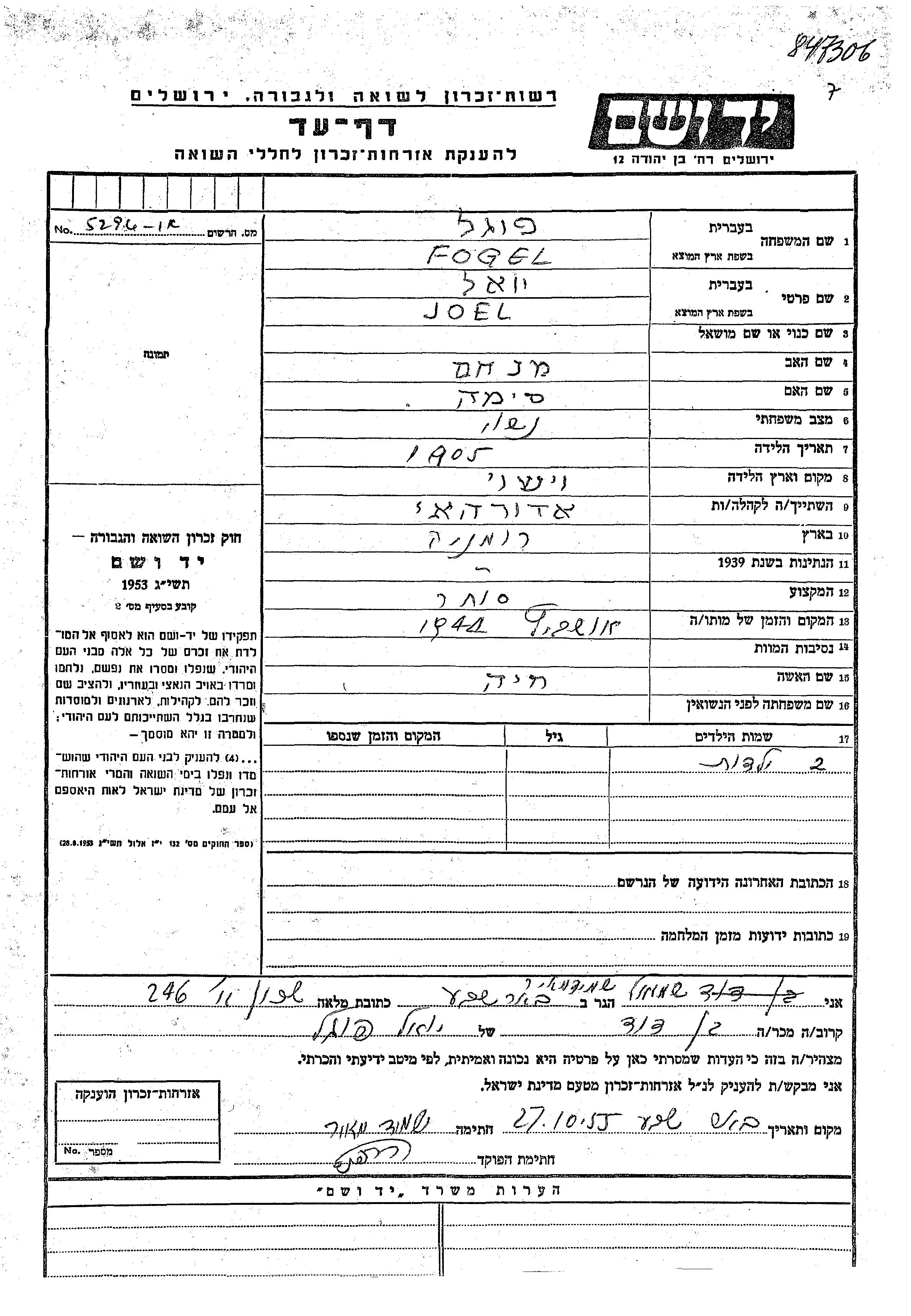 Joel Fogel wurde im Jahr 1905 in Wisho, Rumänien geboren. Er war der Sohn von Menakhem und Sima. Er war Kaufmann/-frau und mit Khaia Verheiratet. Vor dem Zweiten Weltkrieg lebte er in Rumänien. Während des Krieges war er in Rumänien.