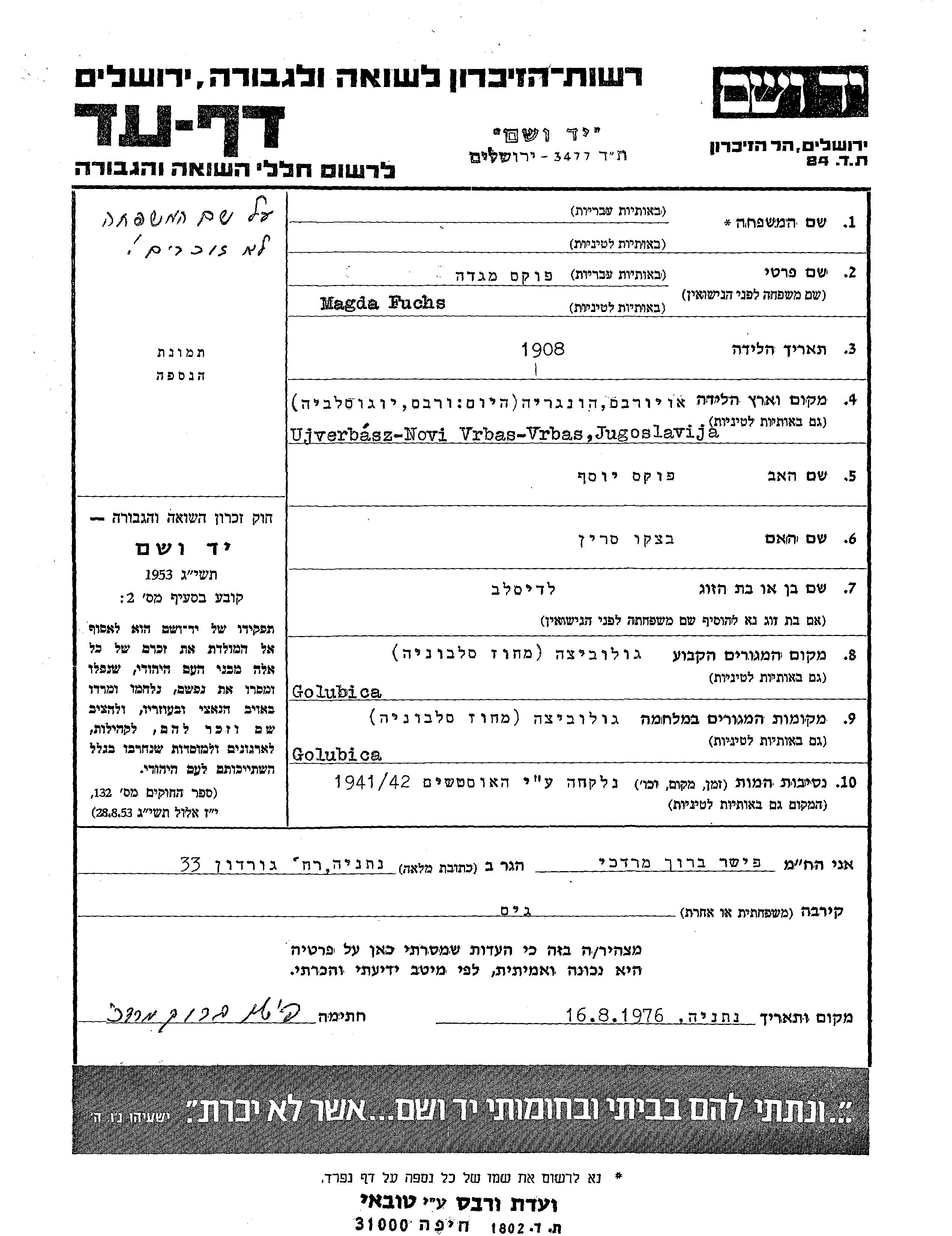 Magda Fuchs, geb. Fuchs wurde im Jahr 1908 in Ujverbasz, Jugoslawien geboren. Sie war die Tochter von Yosef und Sara, geb. Bachko. Sie war mit Ladislav Verheiratet. Vor dem Zweiten Weltkrieg lebte sie in Golubichi, Polen. Während des Krieges war sie in Golubichi, Polen.
