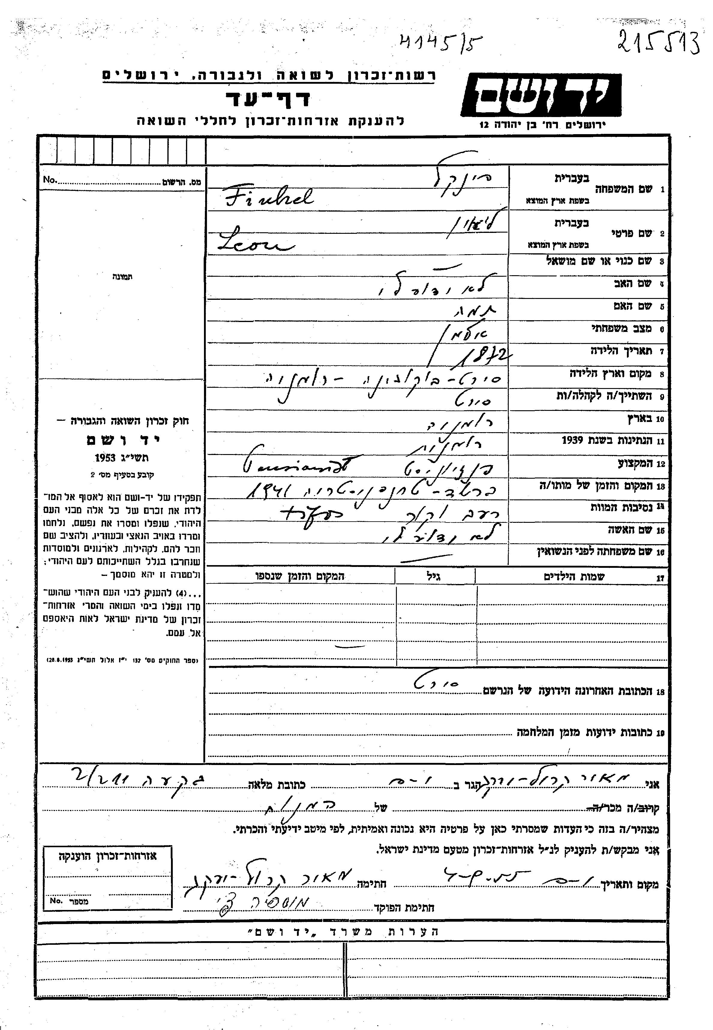 Lion Finkel wurde im Jahr 1872 in Siret, Rumänien geboren. Er war der Sohn von Tama. Er war Rentner/-in und Witwer. Vor dem Zweiten Weltkrieg lebte er in Siret, Rumänien. Während des Krieges war er in Rumänien.