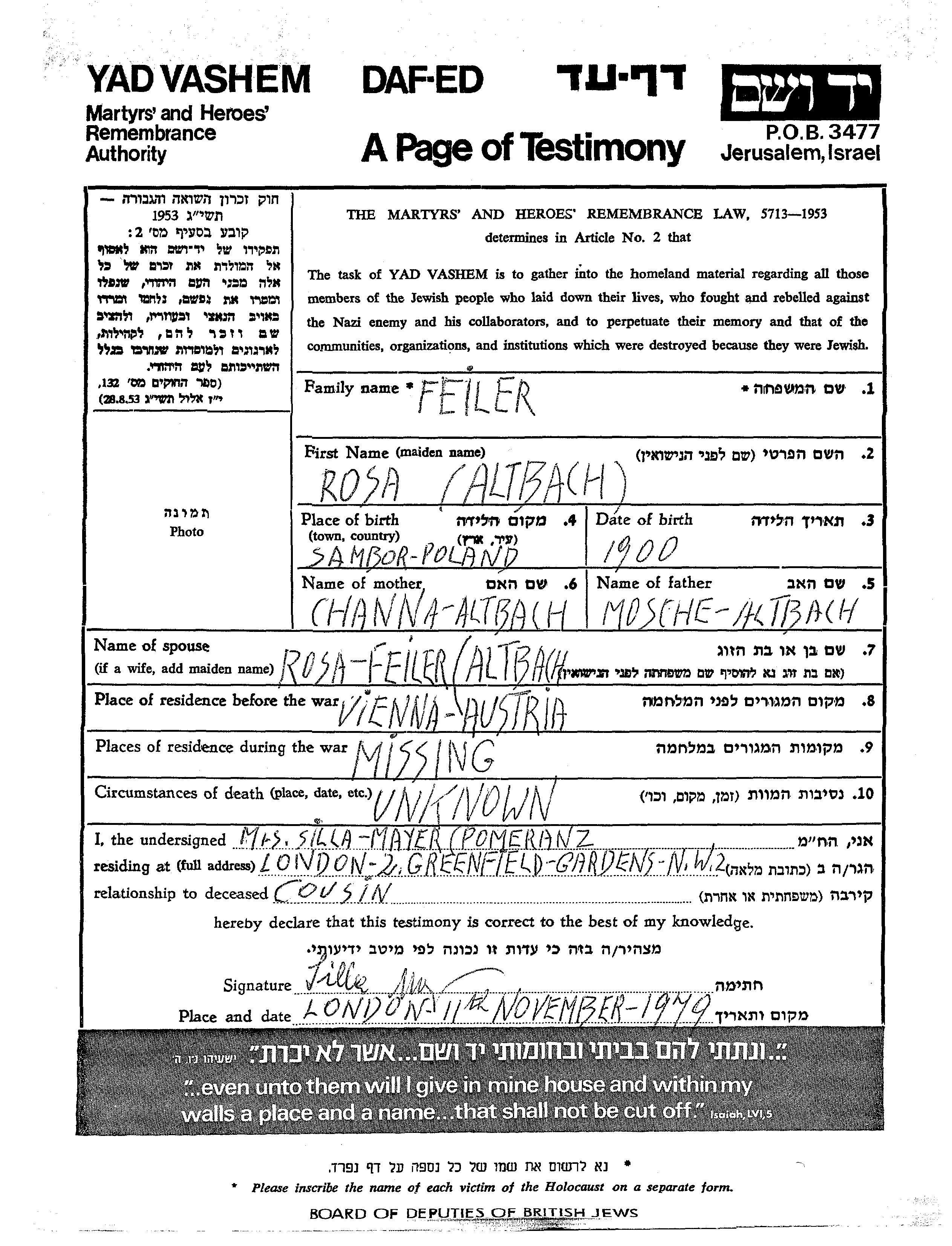 Rosa Feiler, geb. Altbach wurde im Jahr 1900 in Sambor, Polen geboren. Sie war die Tochter von Mosche und Channa. Sie war Verheiratet. Vor dem Zweiten Weltkrieg lebte sie in Vienna, Österreich.