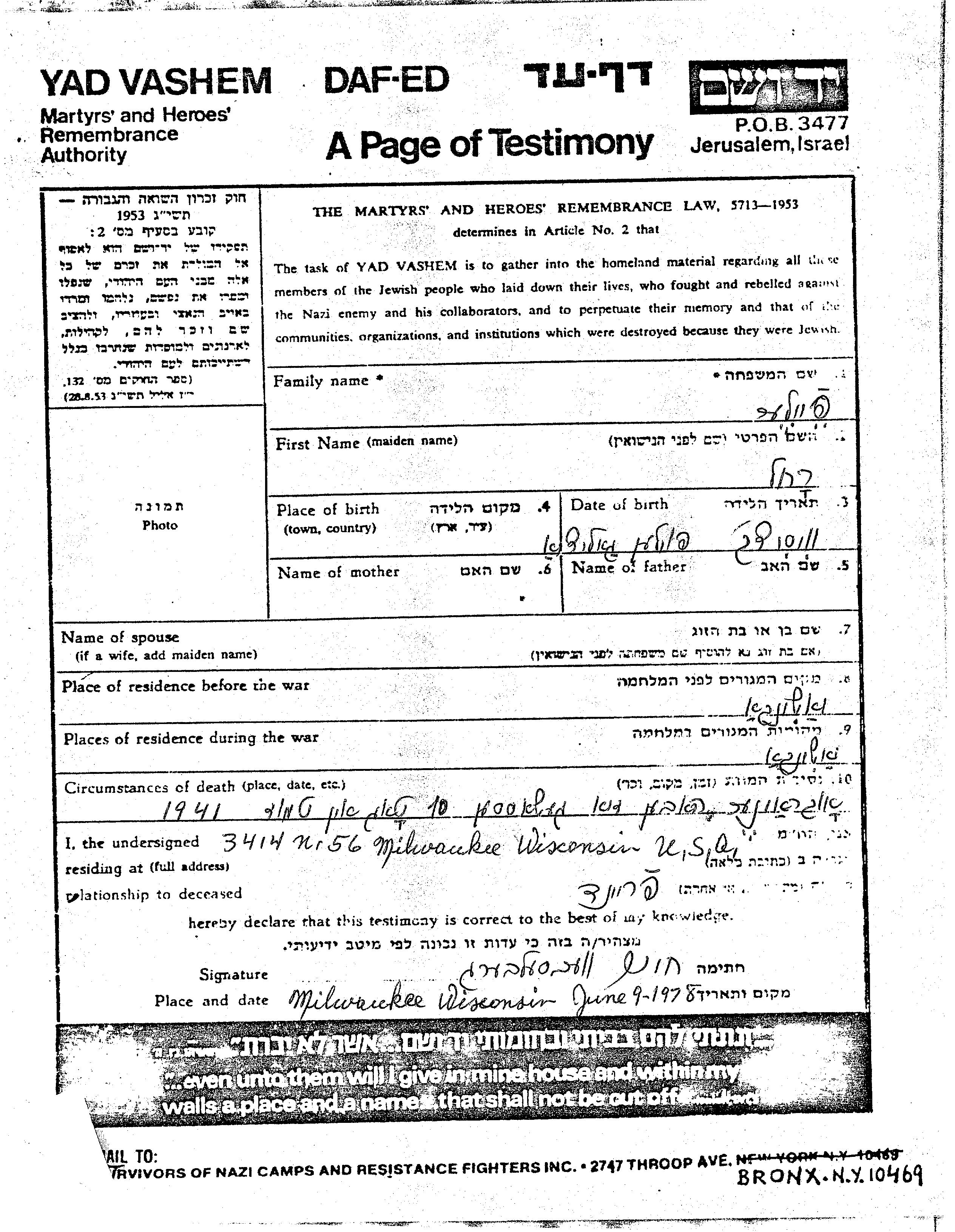 Rakhel wurde in der Schoah ermordet. Todesort: unbekannt im Jahr 1941.