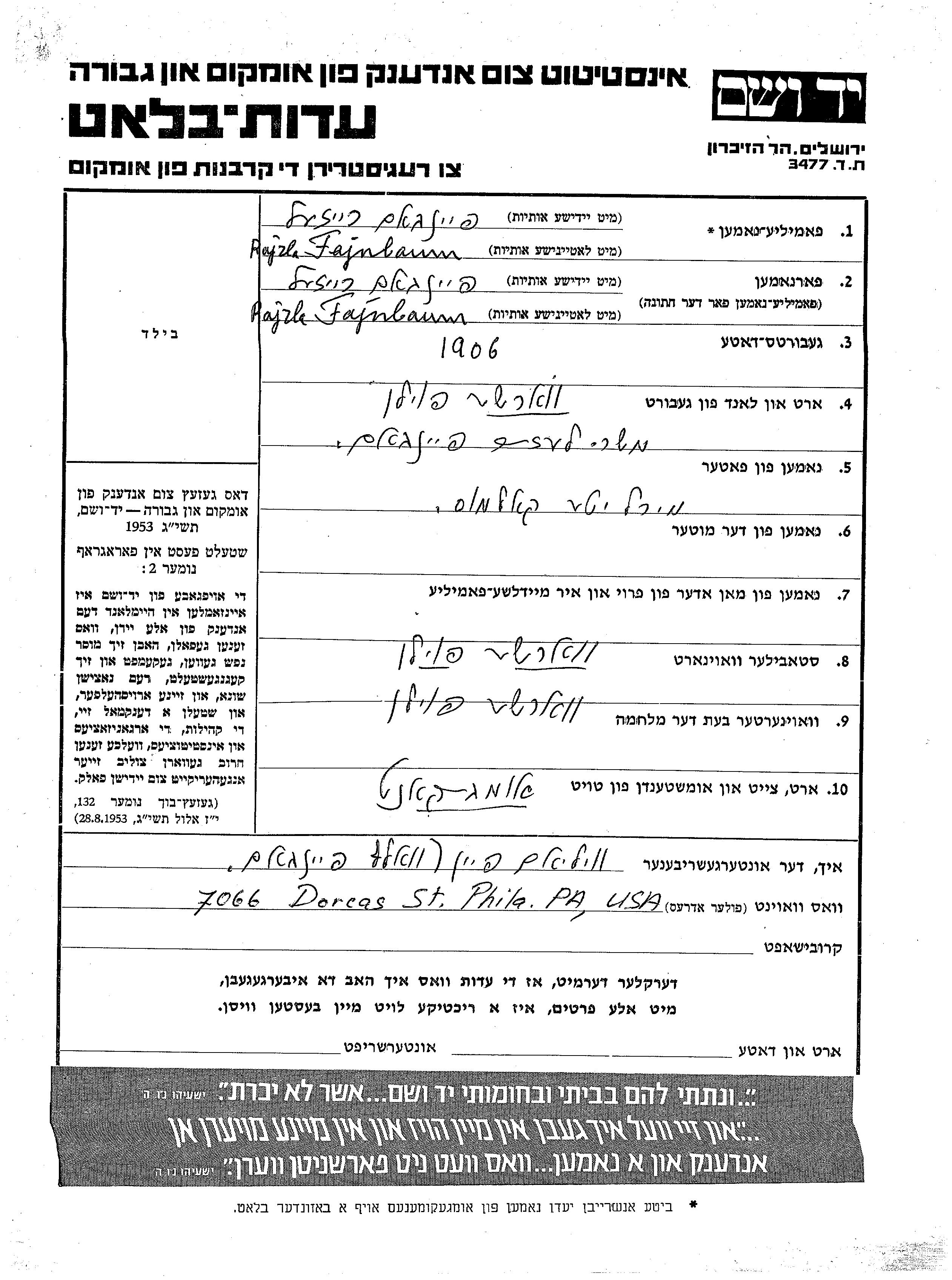 Rajzla Fajnbaum wurde im Jahr 1906 in Warsaw, Polen geboren. Sie war die Tochter von Moshe Lezir und Mirl Ite. Vor dem Zweiten Weltkrieg lebte sie in Warsaw, Polen. Während des Krieges war sie in Warsaw, Polen.