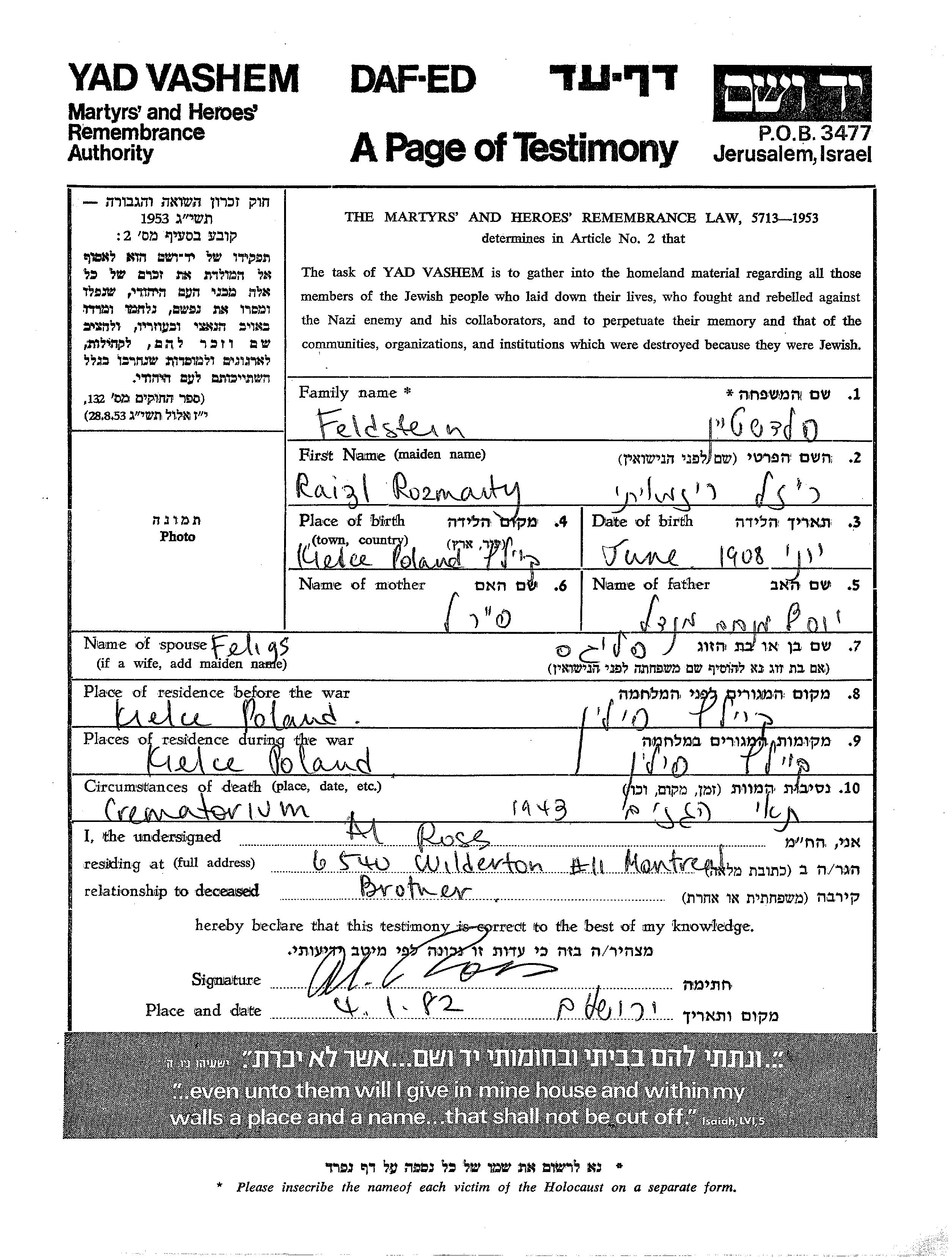 Raizl Rozmaity Feldstein, geb. Rozmaity wurde im Jahr 1908 in Kielce, Polen geboren. Sie war die Tochter von Yosef Menakhem und Perel. Sie war mit Feligs Verheiratet. Vor dem Zweiten Weltkrieg lebte sie in Kielce, Polen. Während des Krieges war sie in Kielce, Polen.
