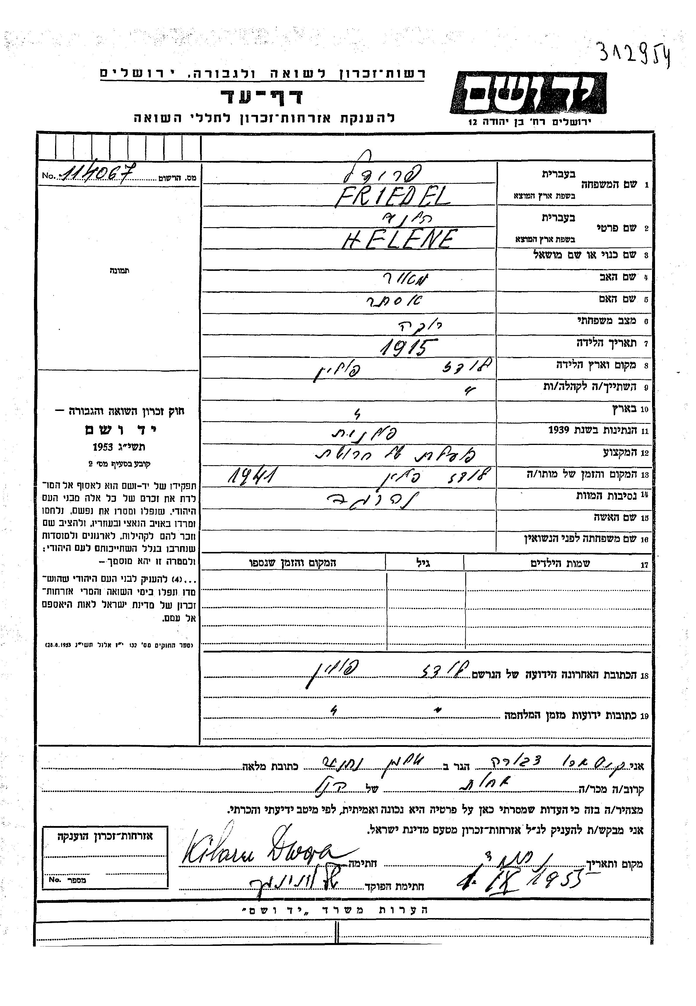 Helene Friedel wurde im Jahr 1915 in Lodz, Polen geboren. Sie war die Tochter von Meir und Ester. Sie war Ledig. Vor dem Zweiten Weltkrieg lebte sie in Lodz, Polen. Während des Krieges war sie in Polen.