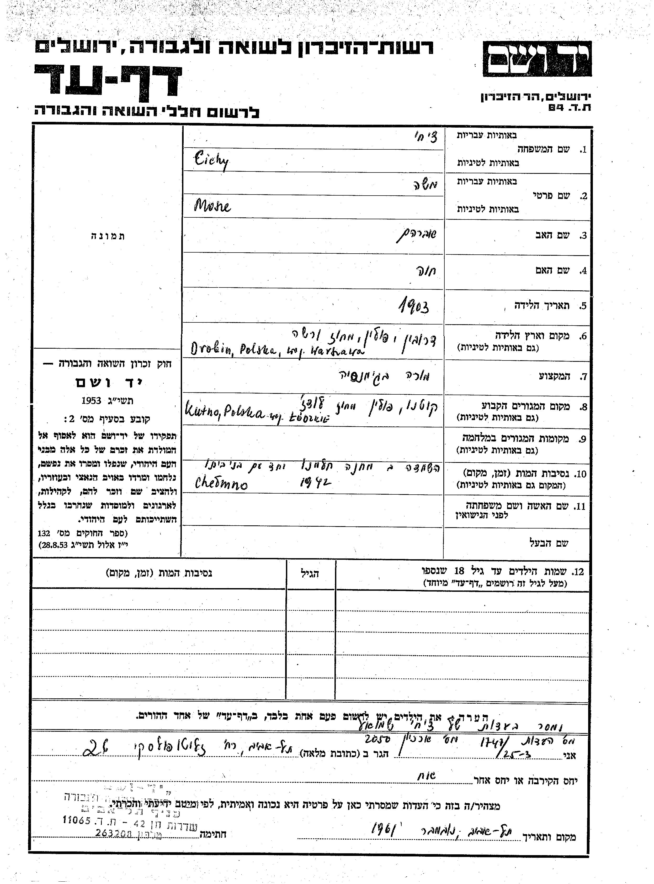Mosze Cichy Chekhi wurde im Jahr 1903 in Drobin, Polen geboren. Er war der Sohn von Avraham und Khava. Er war Gymnasiallehrer/-in. Vor dem Zweiten Weltkrieg lebte er in Kutno, Polen.
