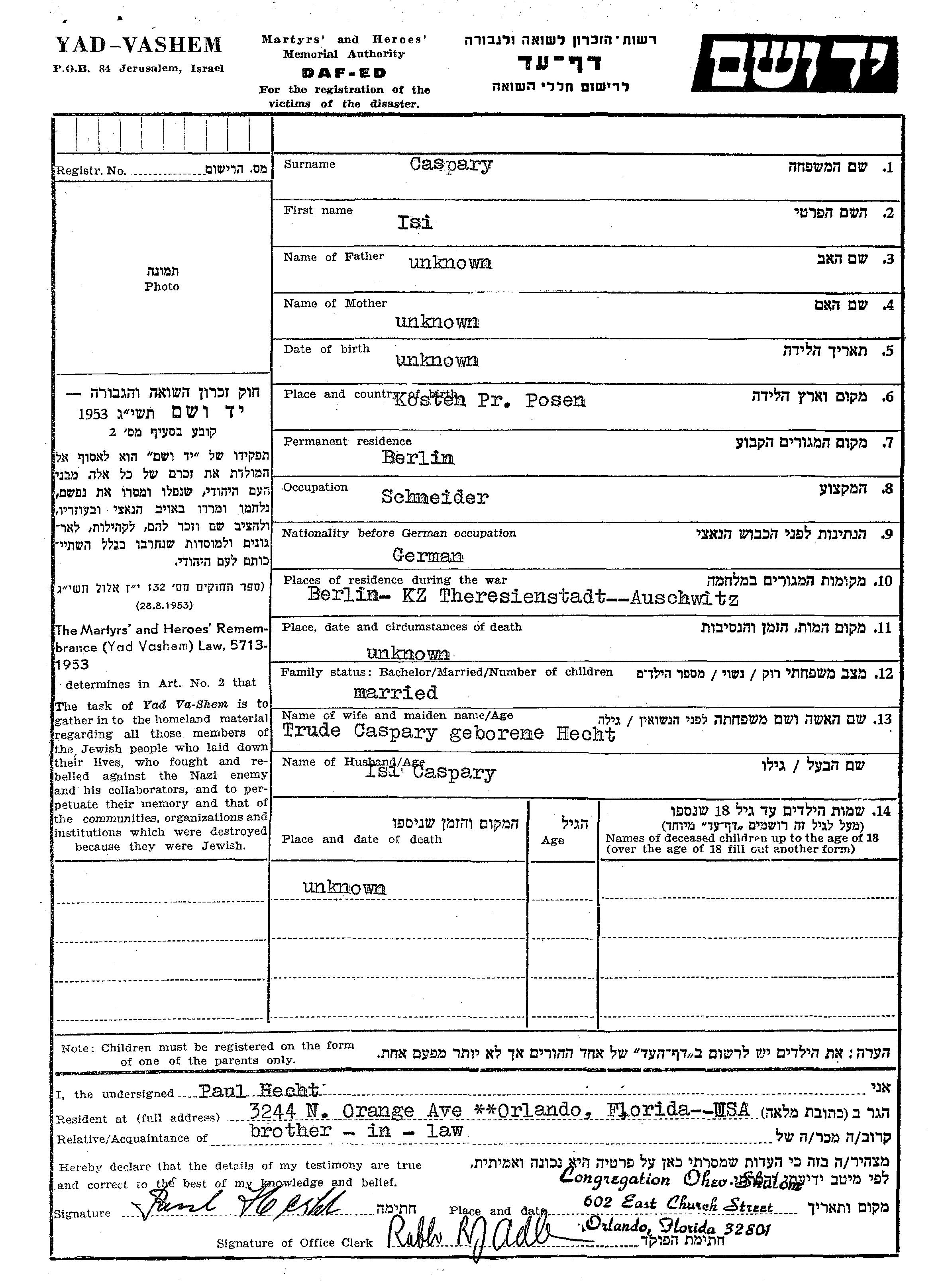 Isi Caspary wurde in Kosten, Polen geboren. Er war Schneider und mit Trude, geb. Hecht Verheiratet. Vor dem Zweiten Weltkrieg lebte er in Berlin, Deutsches Reich. Während des Krieges war er in Auschwitz, Polen.