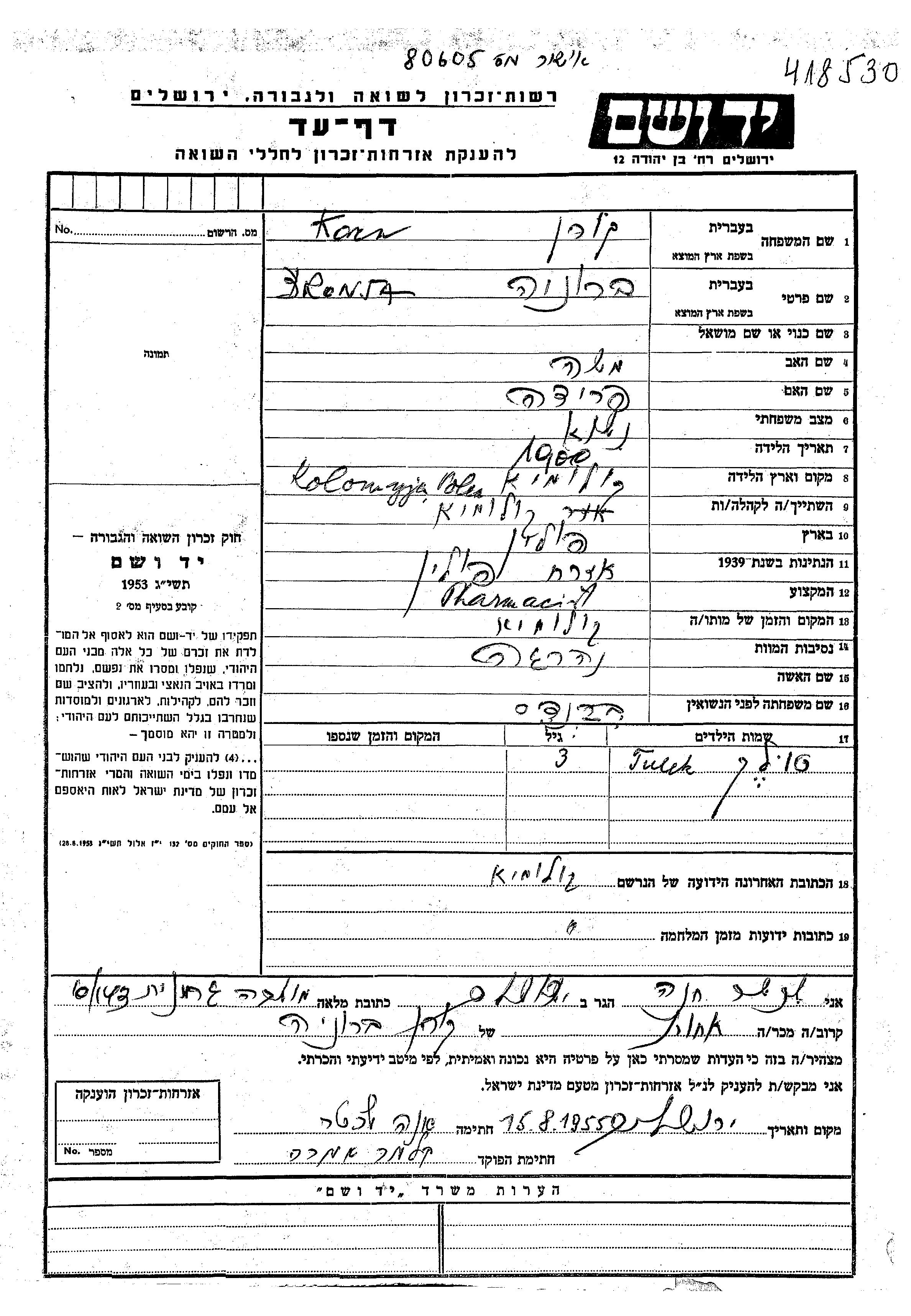 Bronja Korn, geb. Brandes wurde im Jahr 1900 in Kolomyia, Polen geboren. Sie war die Tochter von Moshe und Frida. Sie war Apotheker/-in und Verheiratet. Vor dem Zweiten Weltkrieg lebte sie in Kolomyja, Polen. Während des Krieges war sie in Kolomyja, Polen.