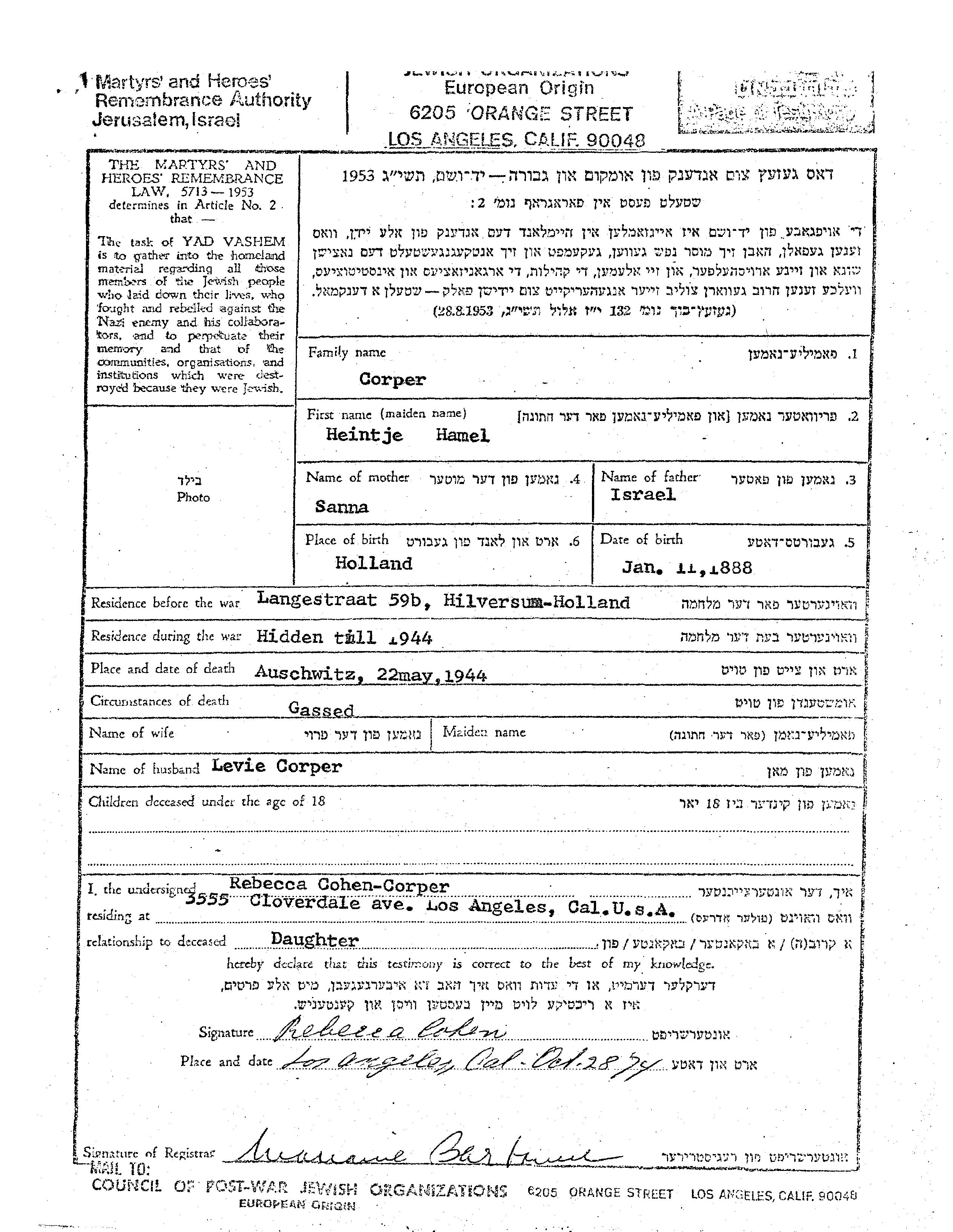 Heintje Hamel Corper wurde im Jahr 1888 in Niederlande geboren. Sie war die Tochter von Israel und Sanna. Sie war mit Levie Verheiratet. Vor dem Zweiten Weltkrieg lebte sie in Hilversum, Niederlande.