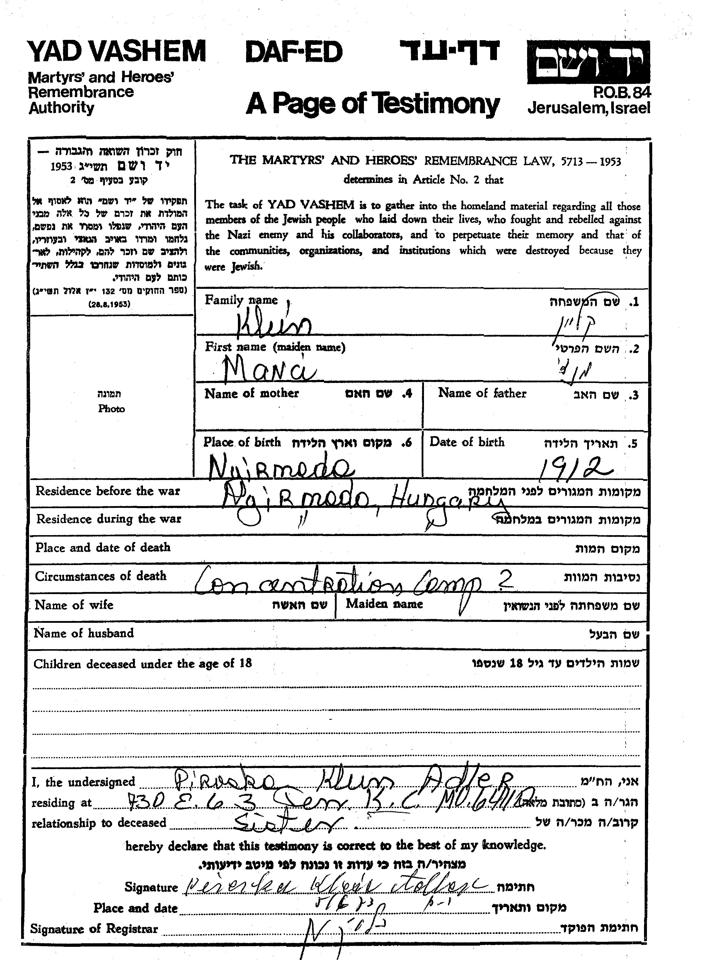 Manci Klein wurde im Jahr 1912 in Nyirmada, Ungarn geboren. Vor dem Zweiten Weltkrieg lebte sie in Nyirmada, Ungarn. Während des Krieges war sie in Nyirmada, Ungarn.