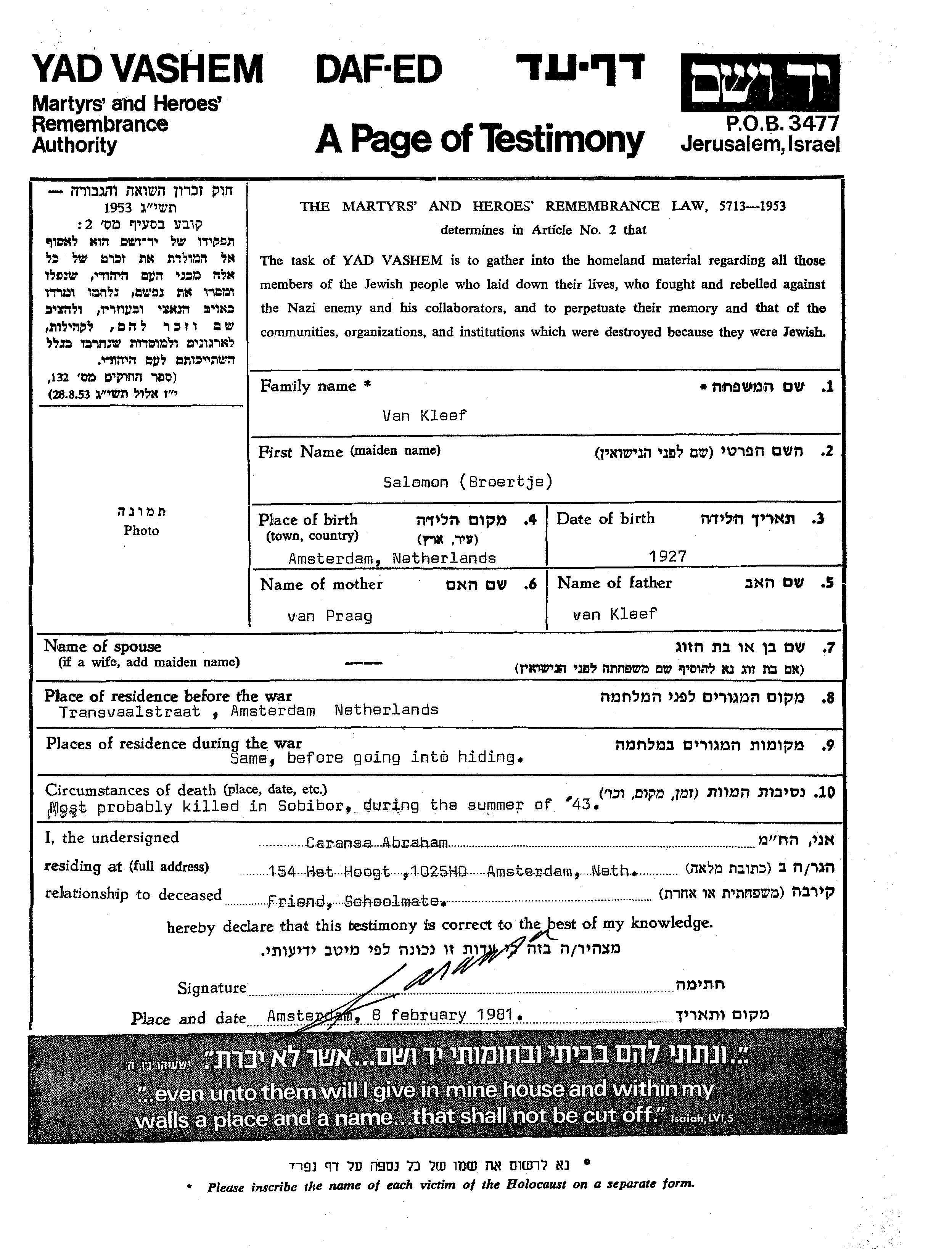 Salomon Kleef van wurde im Jahr 1927 in Amsterdam, Niederlande geboren. Vor dem Zweiten Weltkrieg lebte er in Amsterdam, Niederlande. Während des Krieges war er in Amsterdam, Niederlande.