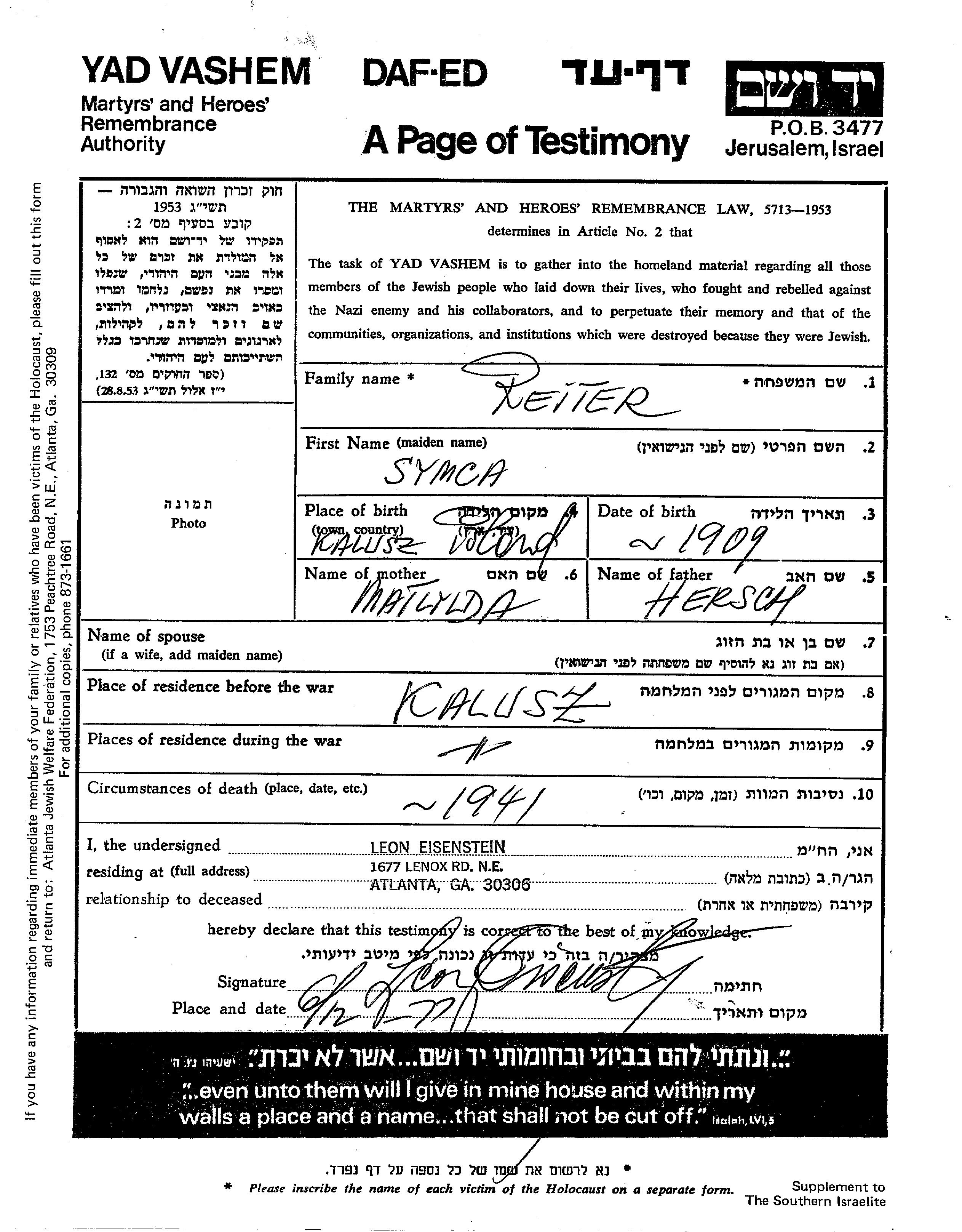 Symca wurde in der Schoah ermordet. Todesort: Kalusz, Polen im Jahr 1941.