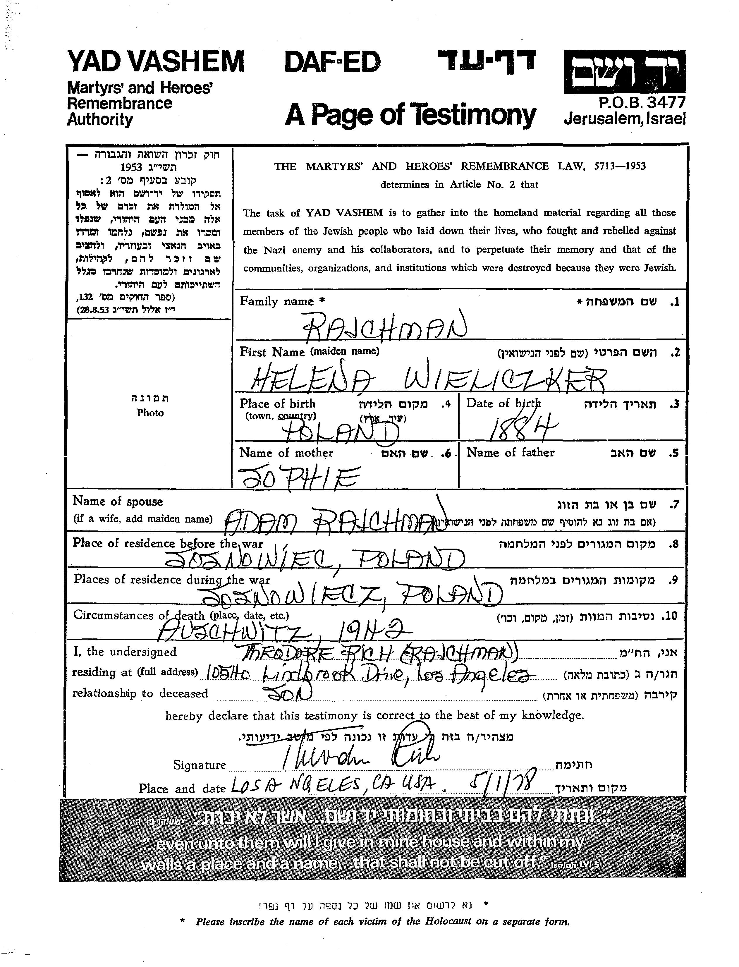 Rajchman Helena 1884 Sosnowiec, Polen Gedenkblatt