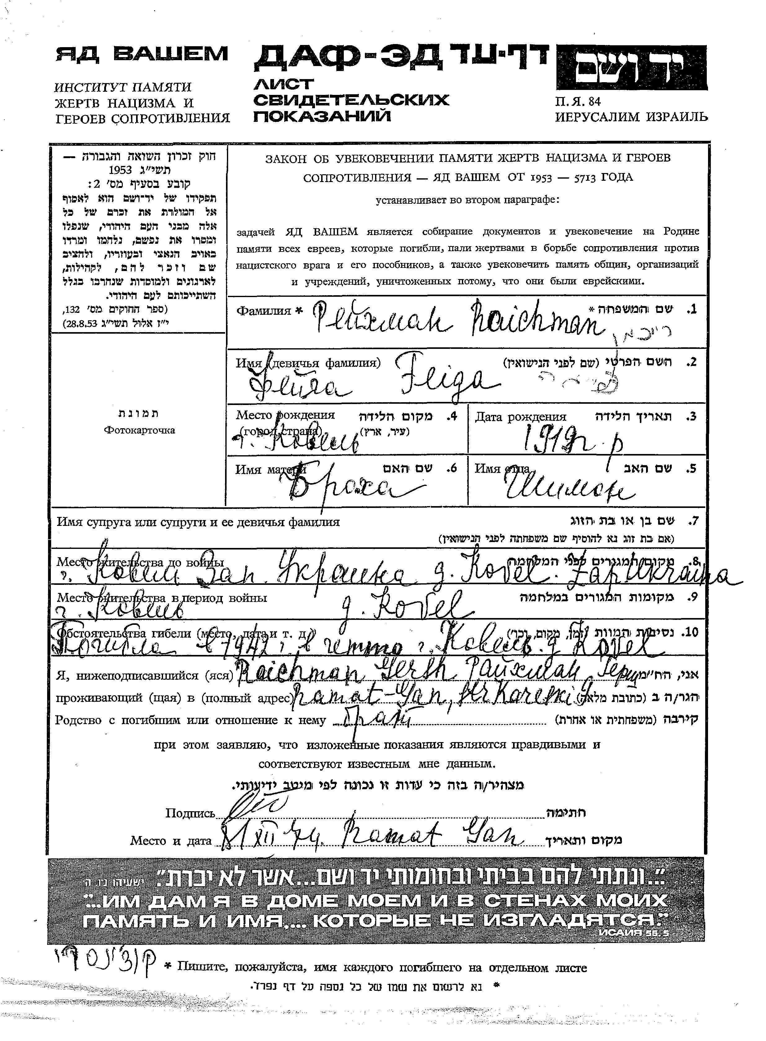 Feiga Reichman wurde im Jahr 1919 in Kovel, Polen geboren. Sie war die Tochter von Shimon und Brocha. Vor dem Zweiten Weltkrieg lebte sie in Kovel, Polen. Während des Krieges war sie in Kovel, Polen.