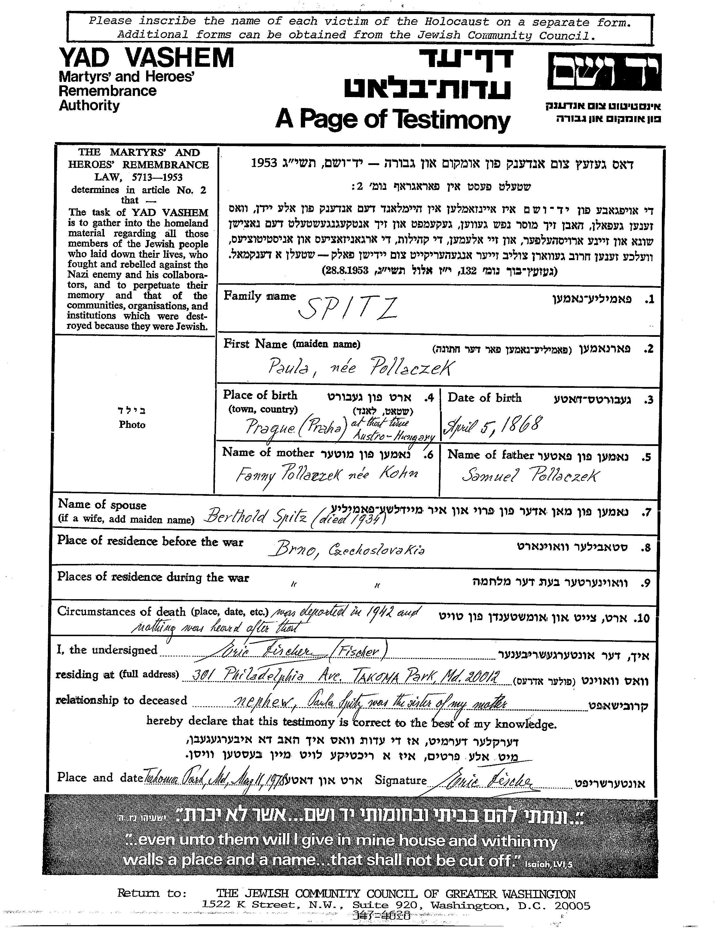 Paula Spitz, geb. Pollaczek wurde im Jahr 1868 in Prague, Tschechoslowakei geboren. Sie war die Tochter von Samuel und Fanny. Sie war mit Berthold Verheiratet. Vor dem Zweiten Weltkrieg lebte sie in Brno, Tschechoslowakei. Während des Krieges war sie in Brno, Tschechoslowakei.